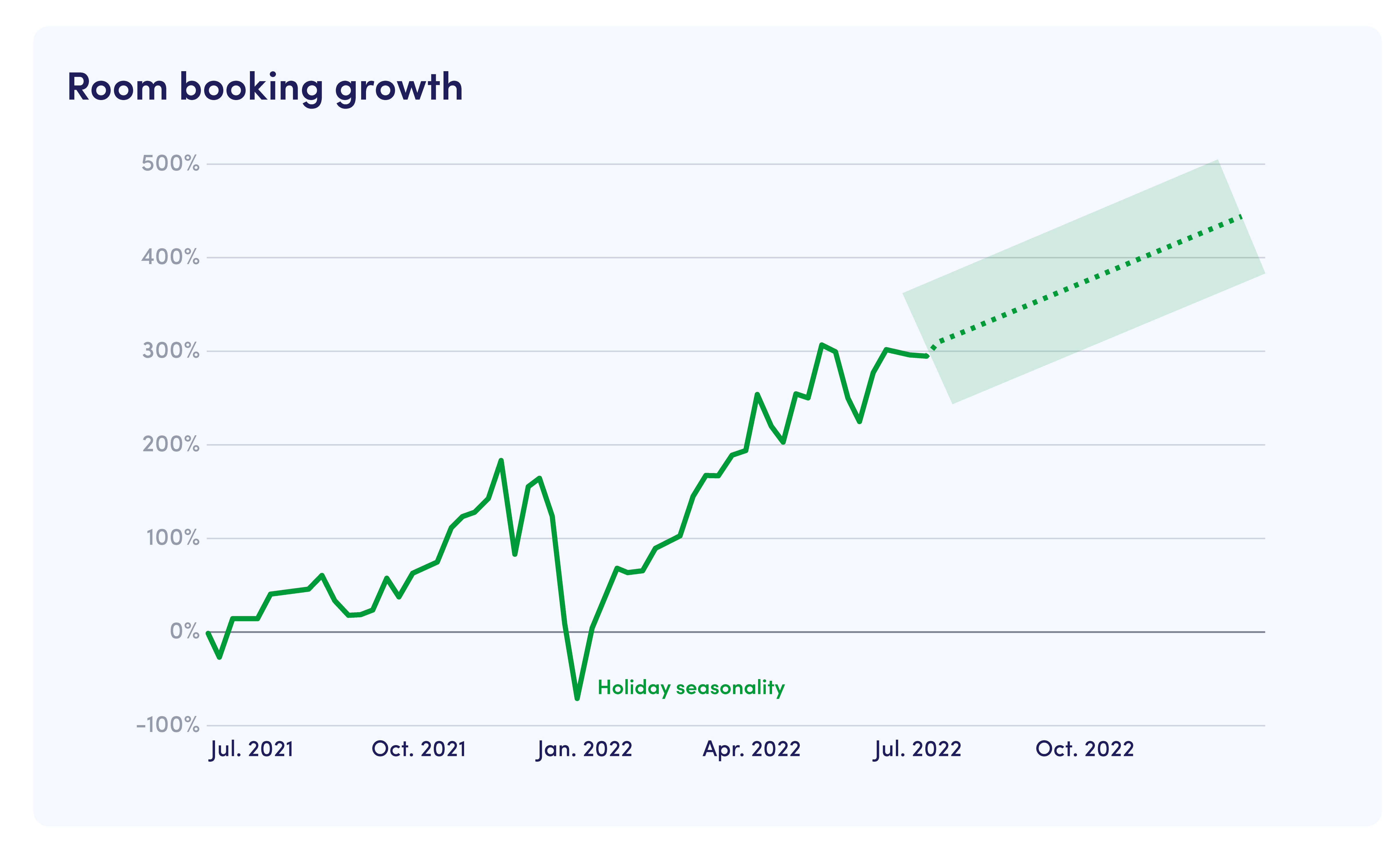 Desk booking is just half of the space management story. We also looked into how employees are booking and using meeting rooms on-site. Since May 2021, room bookings have grown 300%—and we expect that number to continue growing. By the end of the year, we predict that room bookings will grow nearly 500% compared to the previous year.