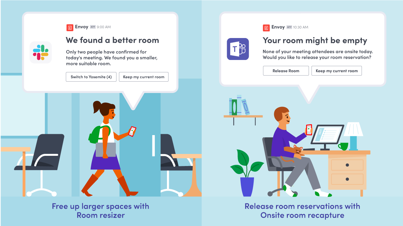 With new automated Space Saver capabilities, Envoy is that digital assistant. Whenever someone is booking a large capacity room, but only has two attendees, Room resizer  will send a nudge through Slack or Teams to encourage the meeting host to switch rooms. Better yet, it will only suggest this when there’s a better capacity room nearby, prioritizing those on the same floor.