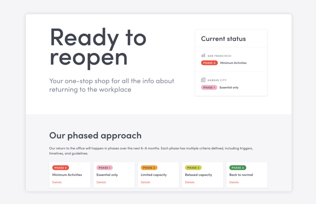 - Ready to Reopen portal: We published all back to work information in a dedicated microsite for employees to find at any time.