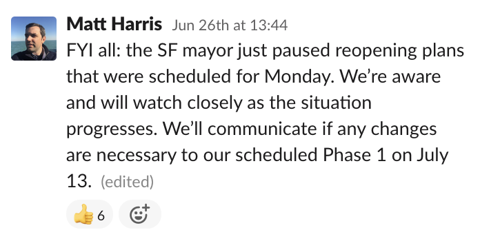 Respond to changes in the moment, too Itâs important to have a regular cadence of updates so that everyone at the company has the same information at the same time. That said, the return to work situation is constantly evolving and regressing. Thereâs a lot of fear, uncertainty, and doubt about whatâs happening and how employees will be affected. When things changed, we communicated to employees outside of the regular schedule: