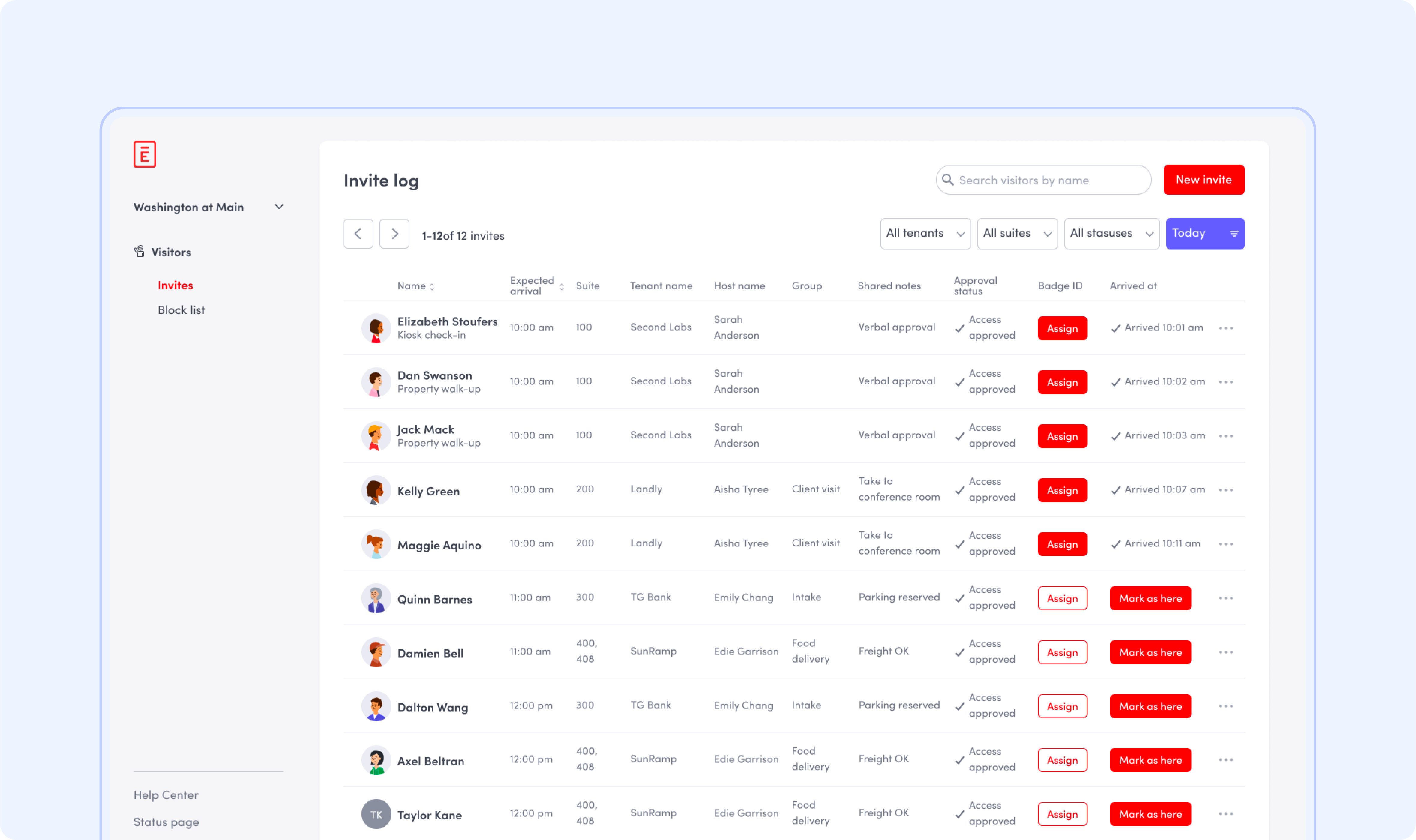 As part of this first phase of Envoy Connect, we've taken our industry-proven Visitors product and extended it to serve entire multi-tenant buildings. This isn't just a rebranding of an existing product – it's a complete rework of the entire visitor experience. We're addressing most of the major pain points our customers have today with highrises to make things much easier for everyone: visitors won't need to sign in twice anymore, invitations made by employees for their office will propagate instantly to the building security lobby, changes to invitations will sync in real-time, turnstile and elevator access control will be automatically provisioned, and much more. Property managers will have access to a new dashboard that combines all tenants' expected visitors in one view. They can also see data and compare analytics across all of their buildings, including the per-tenant usage data, and can globally configure settings like a universal block list. This is an ambitious first step and the foundation to enabling great experiences for so many more current and future interconnected products.
