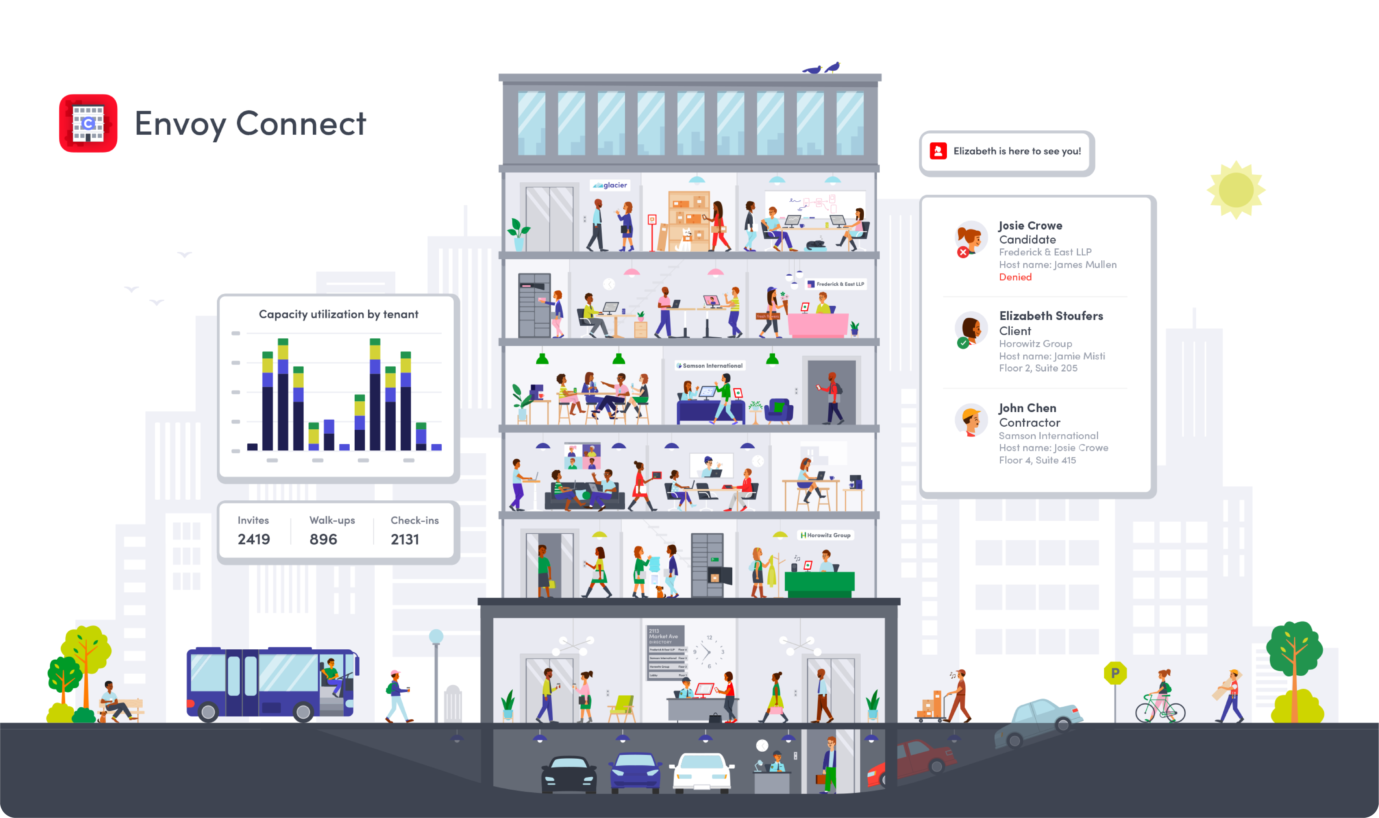 Today we’re making a big next step for bringing thoughtful workplace experiences to entire buildings – announcing Envoy Connect! Connect brings buildings and property managers into the Envoy product suite by linking their day-to-day operational systems with those of their tenants. This will allow for new levels of hospitality, security and analytics – key priorities for top-tier properties. Over time, Connect will create an opportunity for cross-tenant services like car pooling, for-sale marketplaces, and even sharing of desks, rooms, parking spots and more. We hope to open a whole developer platform around this concept soon, leading to innovations we haven't even thought of yet. Developers will get the attention and distribution they deserve while also being able to focus on building outstanding workplace products they’re passionate about.