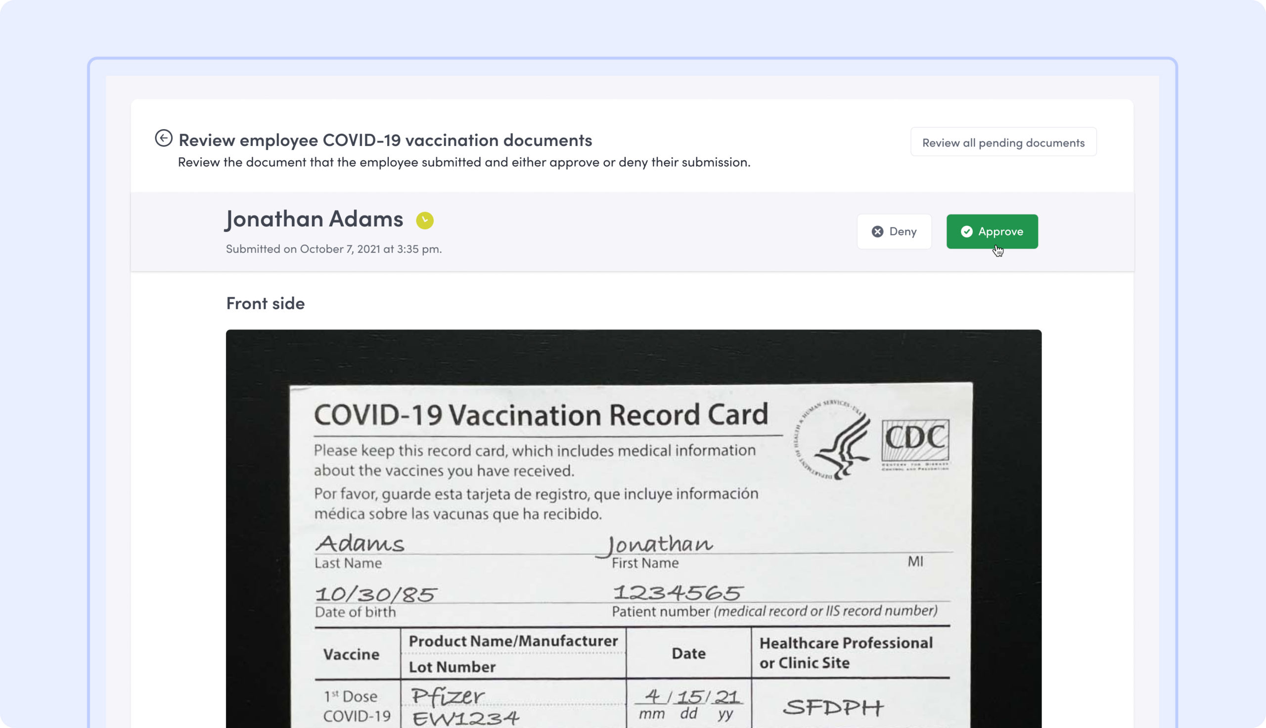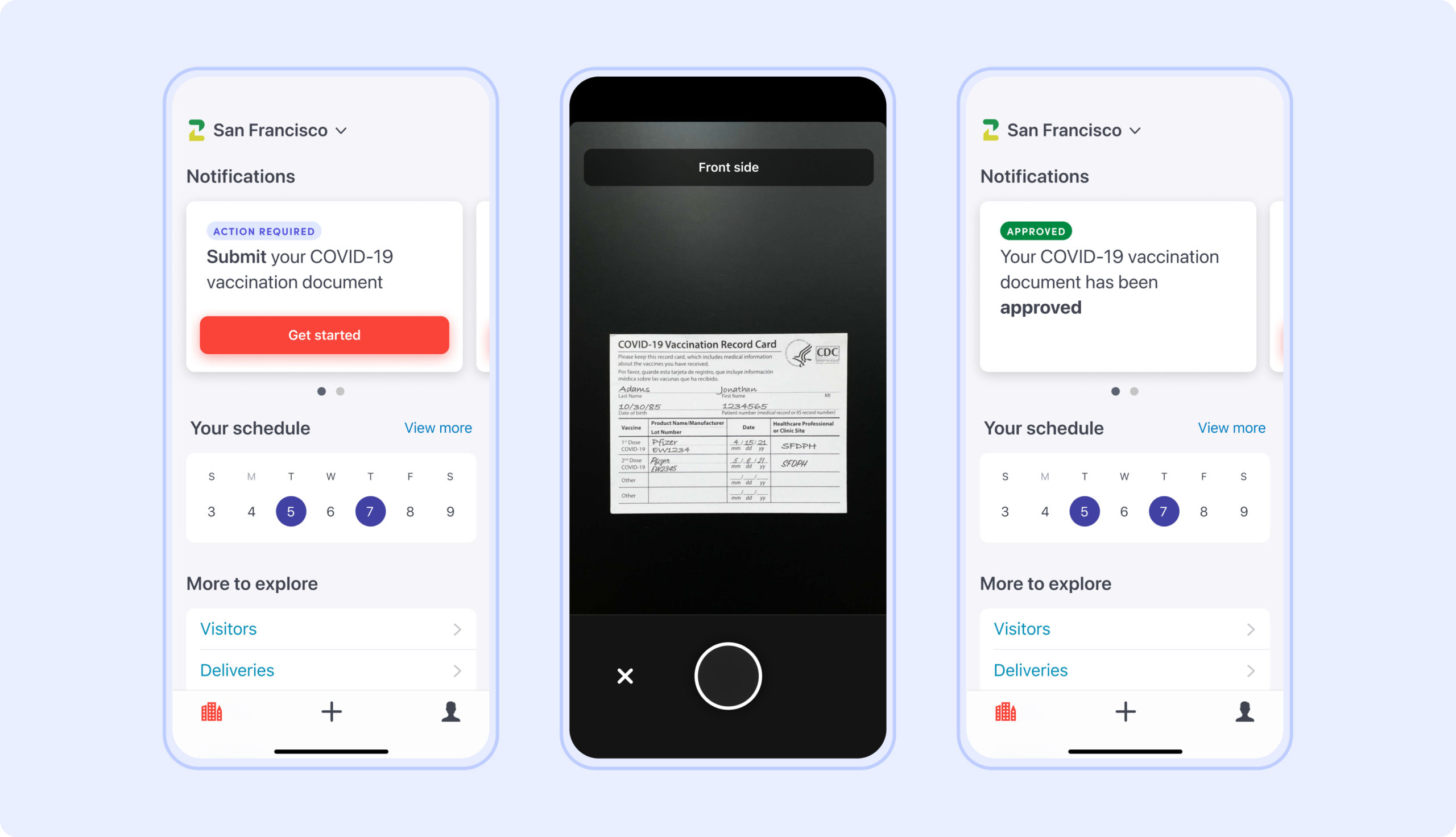 Over 5,000 companies have already been using Envoy Protect for the past year and a half to conduct employee health screenings, manage office capacity, and contact trace. Now, they can also use Protect to verify employee vaccination status. Employees can upload proof of vaccination with the Envoy mobile app. Once an admin verifies their vaccine card, employees can skip the daily health questionnaire and self-attested Covid test results.