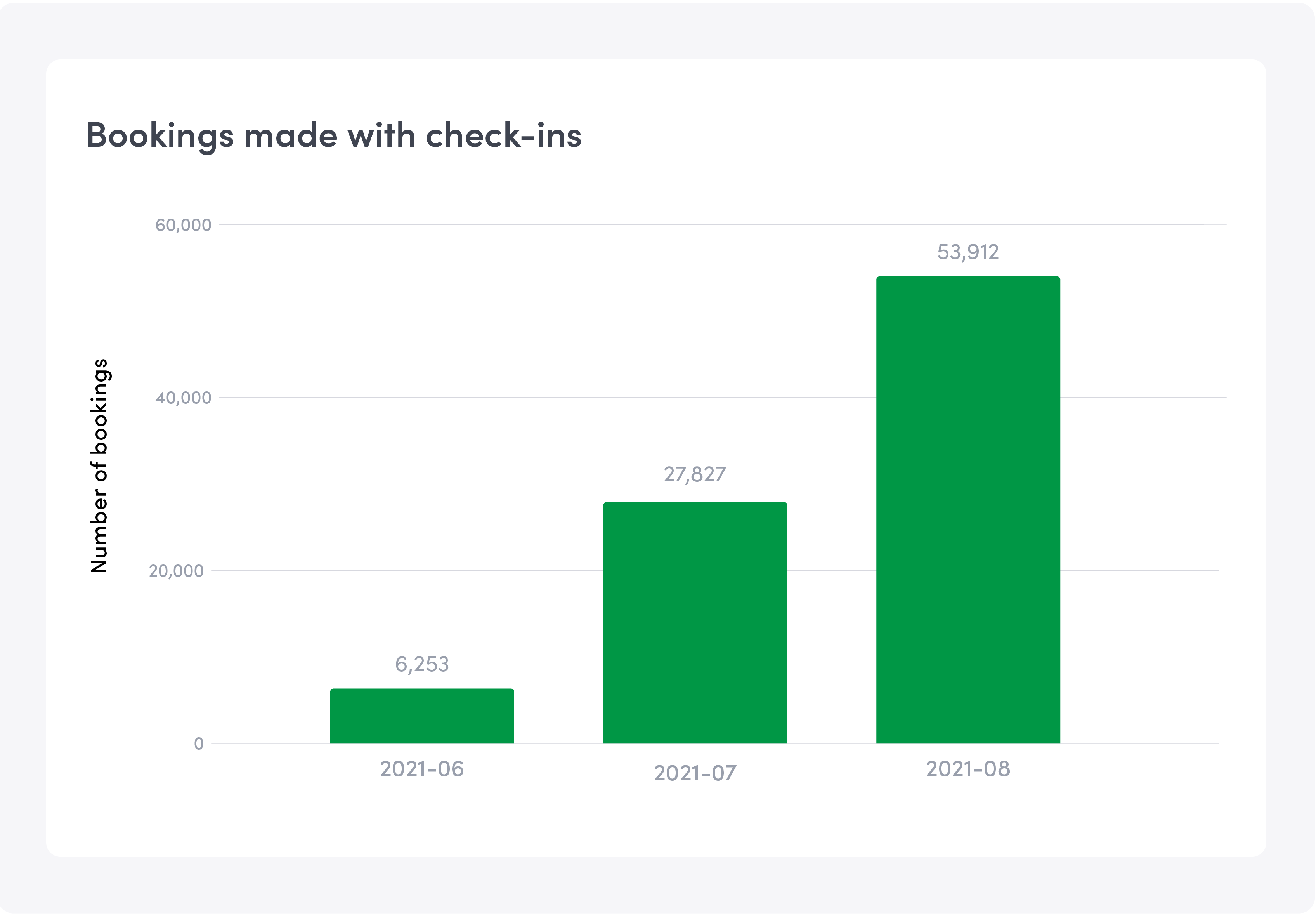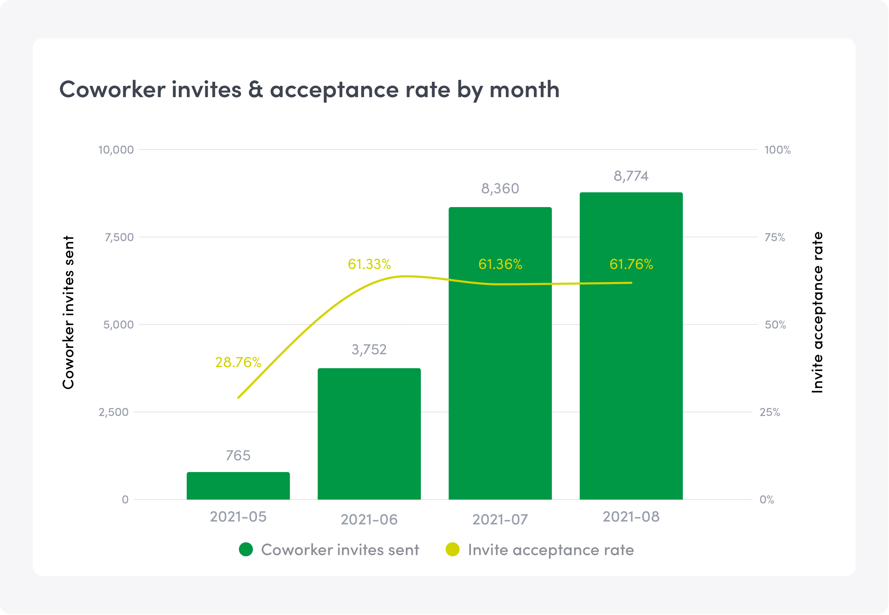 The graph above shows the number of invites sent each month since June 2021. You can also see the percentage of invites that led to someone coming into the workplace—61% in June, July, and August 2021.
