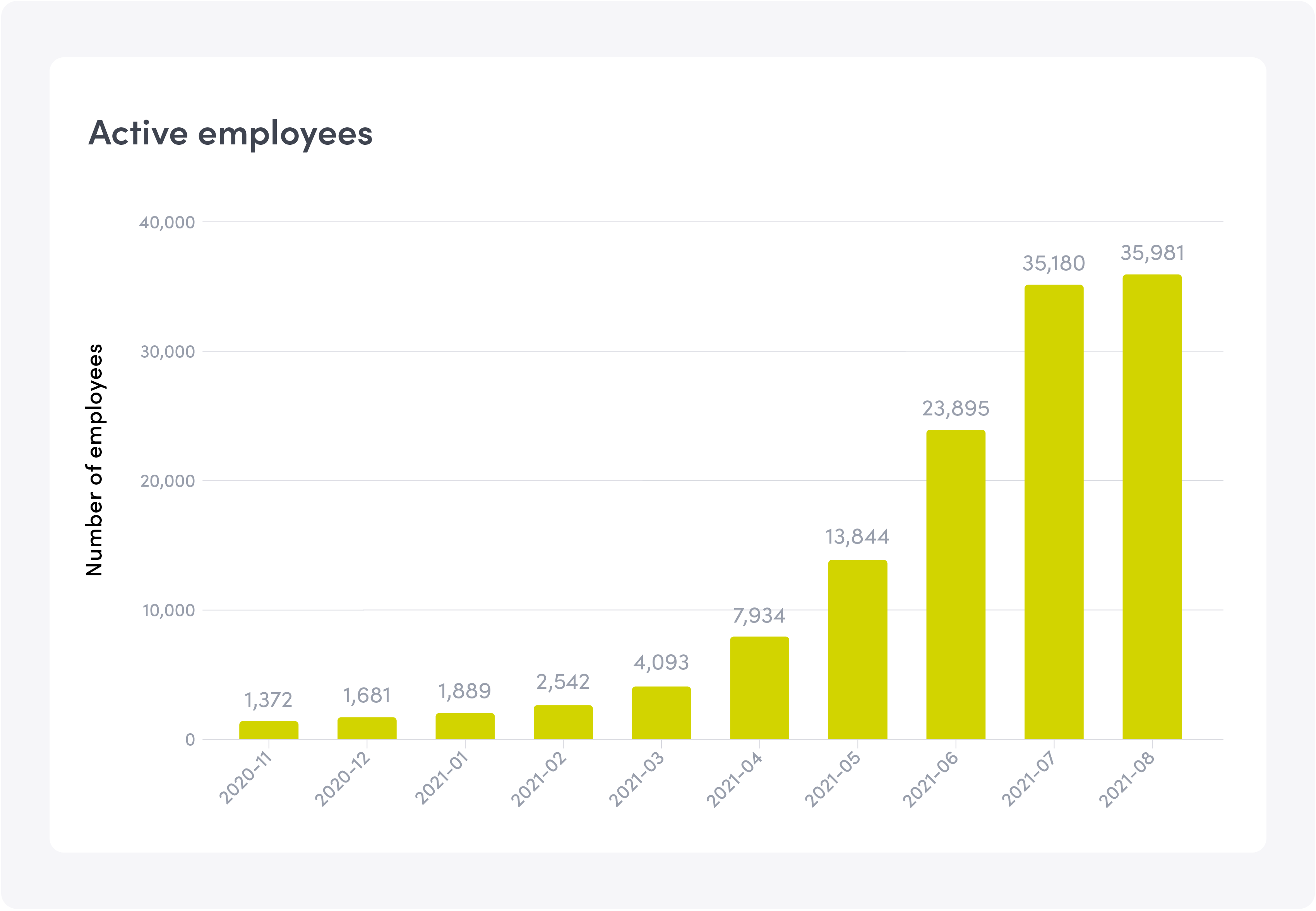 From May to August 2021, the number of companies actively using Desks grew by more than 70%. What’s even more impressive is that the number of active employees—those with one or more desk bookings—nearly tripled.