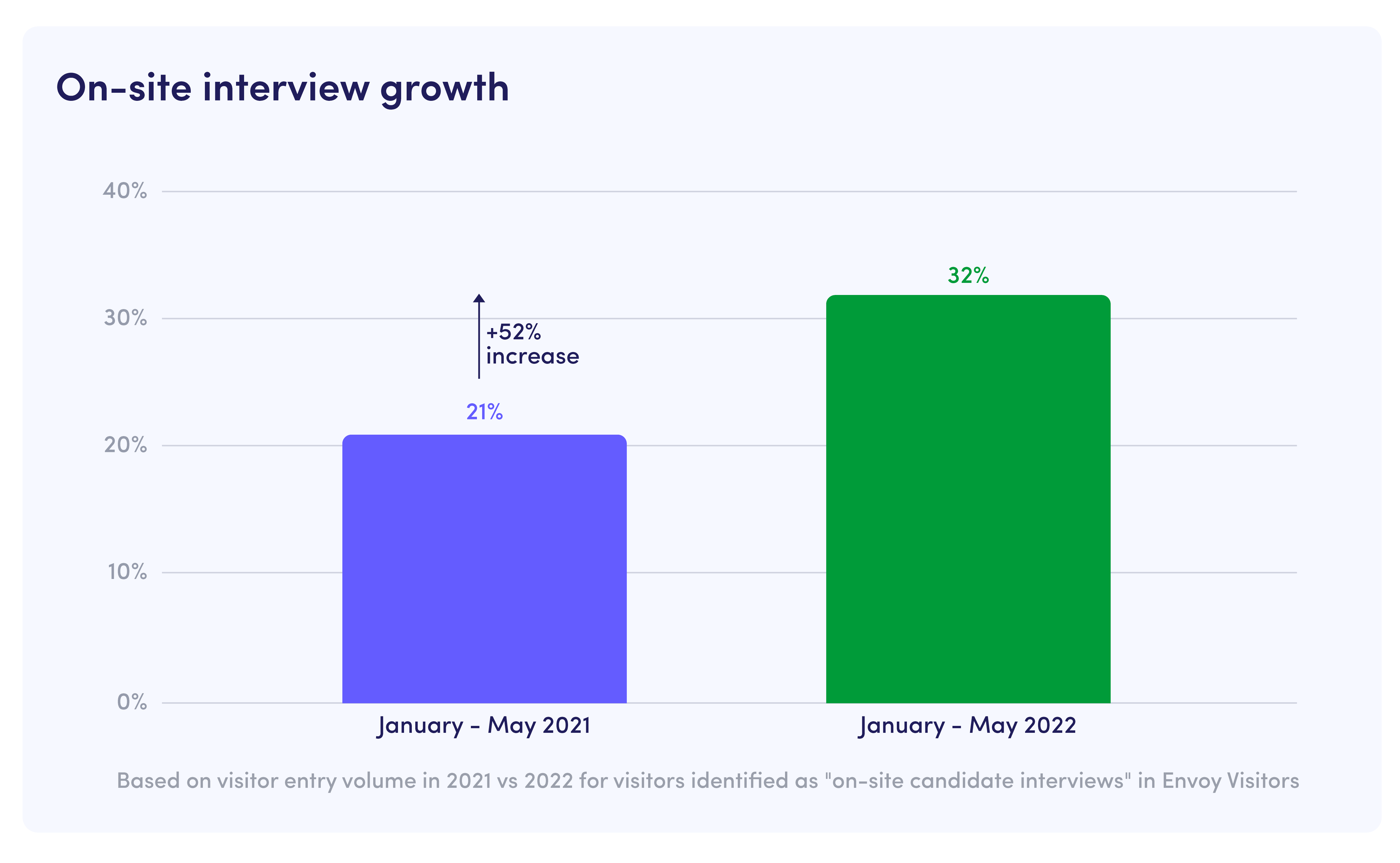 Why is enterprise traffic growing faster than others? Itâs not just because they have more employees. These companies are also seeing workplace visitors return in droves. Workplace foot traffic includes both employees and visitors going on-site. Visitors traffic alone is up +43% so far this year. Enterprise companies are seeing higher growth ratesâvisitor traffic is up +51% YTD. One source of this increase in visitors comes from companies who are inviting candidates on-site to interview in person. Since the start of 2022, on-site interview growth is up +32%. This is a +52% increase compared to last year which was only at +21% in the same period. Companies realize that they can use the workplace to attract top talent and provide a better candidate experience in-person. Plus, who isnât getting tired of back-to-back Zoom interview panels?