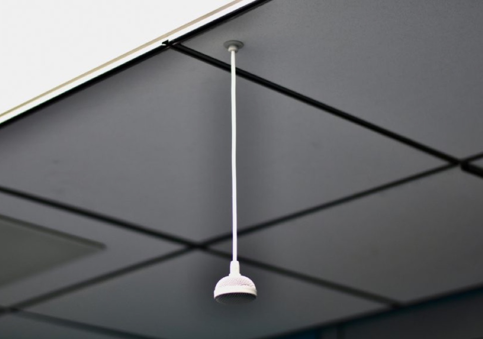 Hanging microphones and speakers in the ceiling. (All of our rooms have drop ceilings, so installation is easy.)