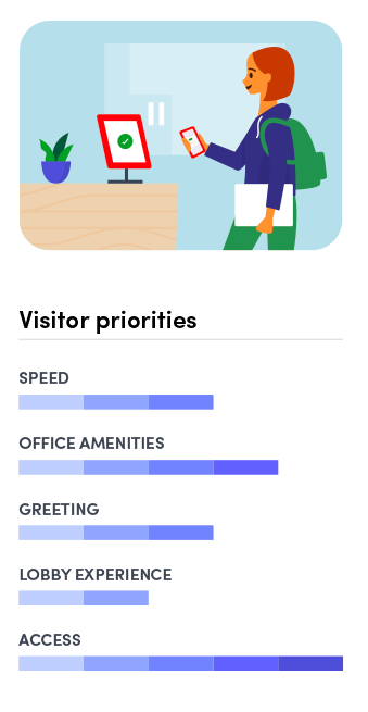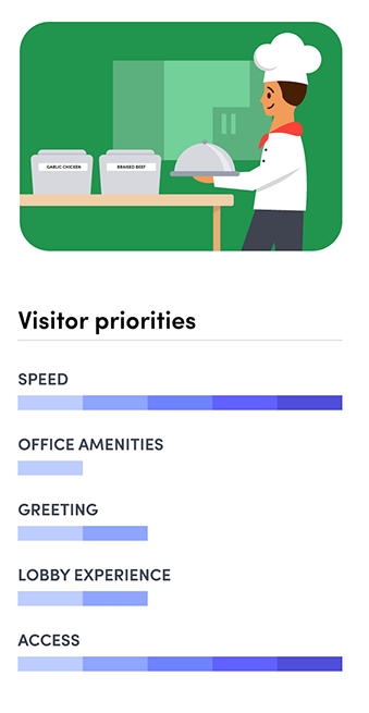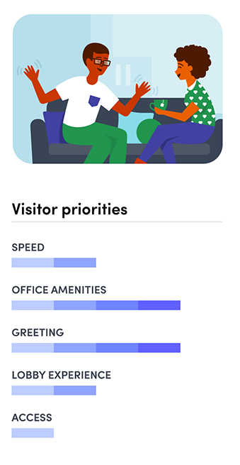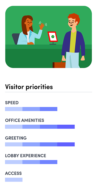 A great visitor experience will help strengthen your working relationship, foster a deeper sense of connection among employees and clients, and impress your visitors with your brand, products, and culture. For this visitor group, your top priorities are speed and comfort.