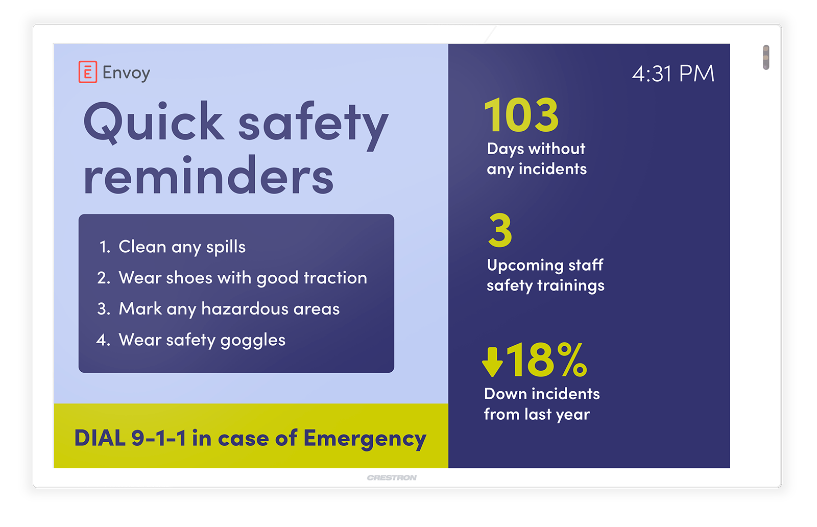 Organizations can broadcast messaging for safety, company announcements, and real-time workplace data across Crestron-enabled displays. This includes emergency notifications, occupancy and attendance insights, room availability, schedules, and other operational updates—all managed centrally through Envoy.