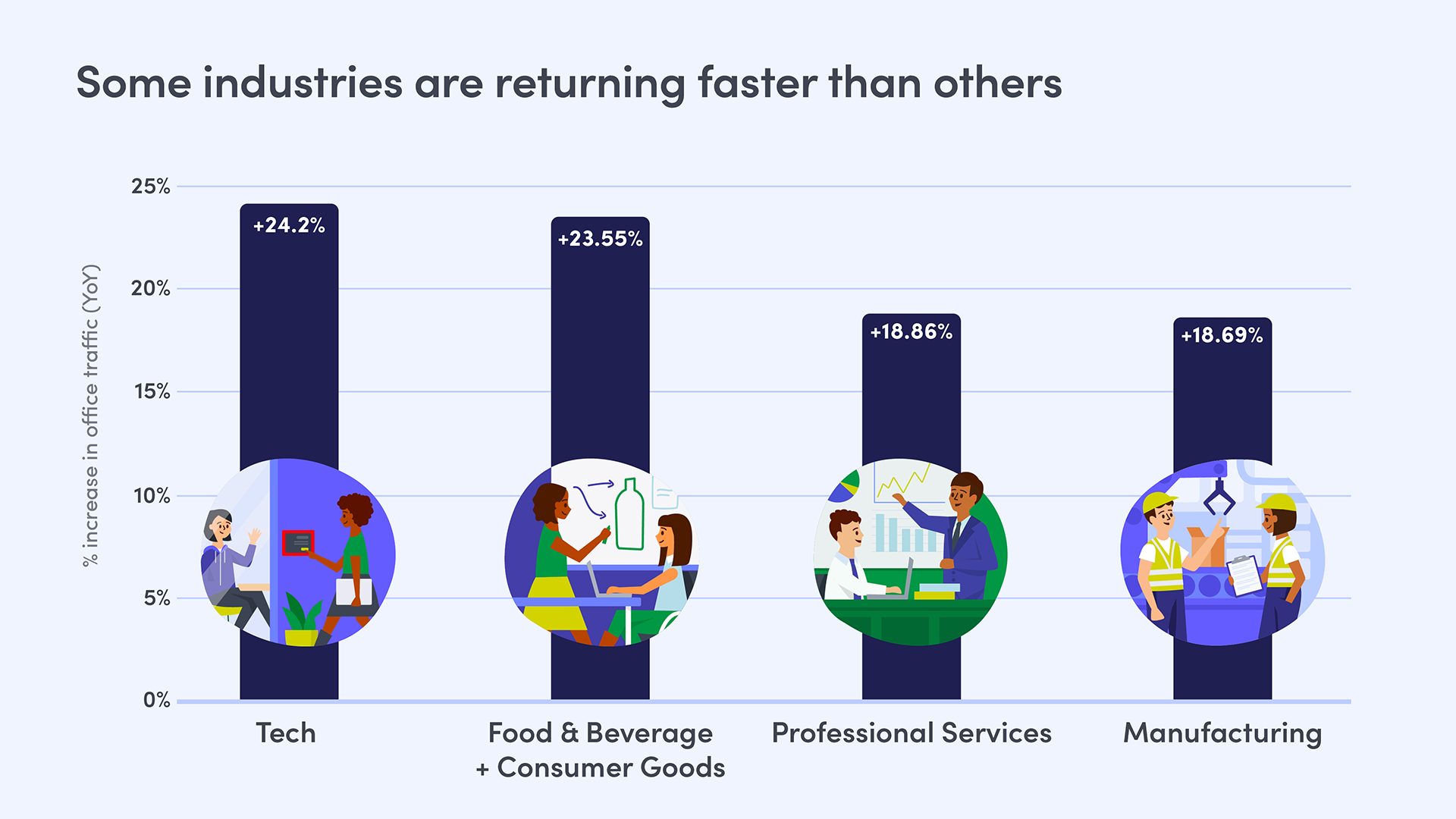 Attendance trends also vary by industry. The tech sector saw the most significant increase, with a 24.2% YoY rise in office traffic. Not far behind: