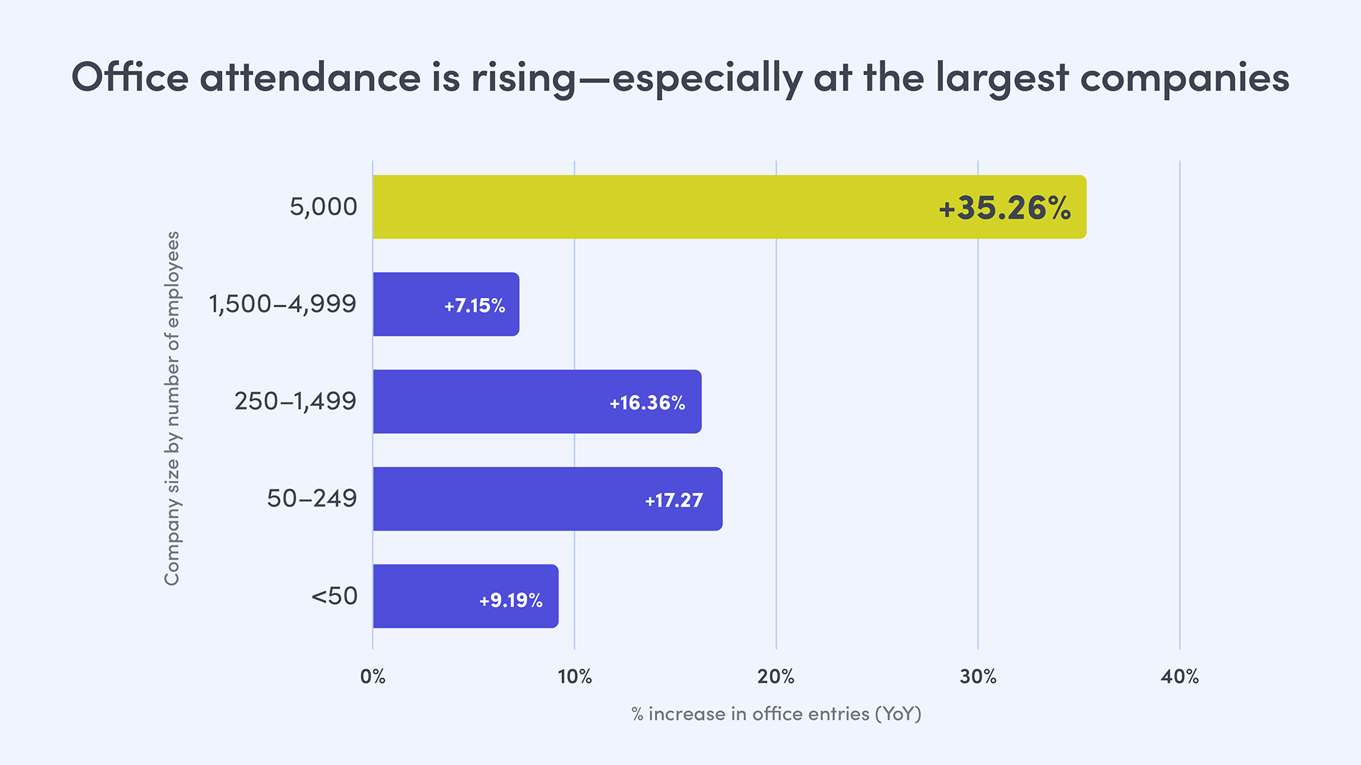 The strongest growth in office attendance came from the largest employers. Companies with more than 5,000 employees saw a 35.26% jump in workplace entries compared to 2024. That’s more than double the national average.