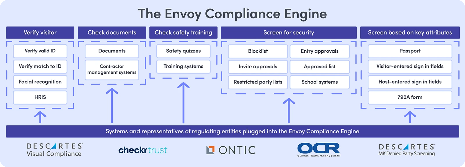 Envoy automates ID verification, document capture, training validation, and security screenings—so you stay audit-ready without adding lobby friction.