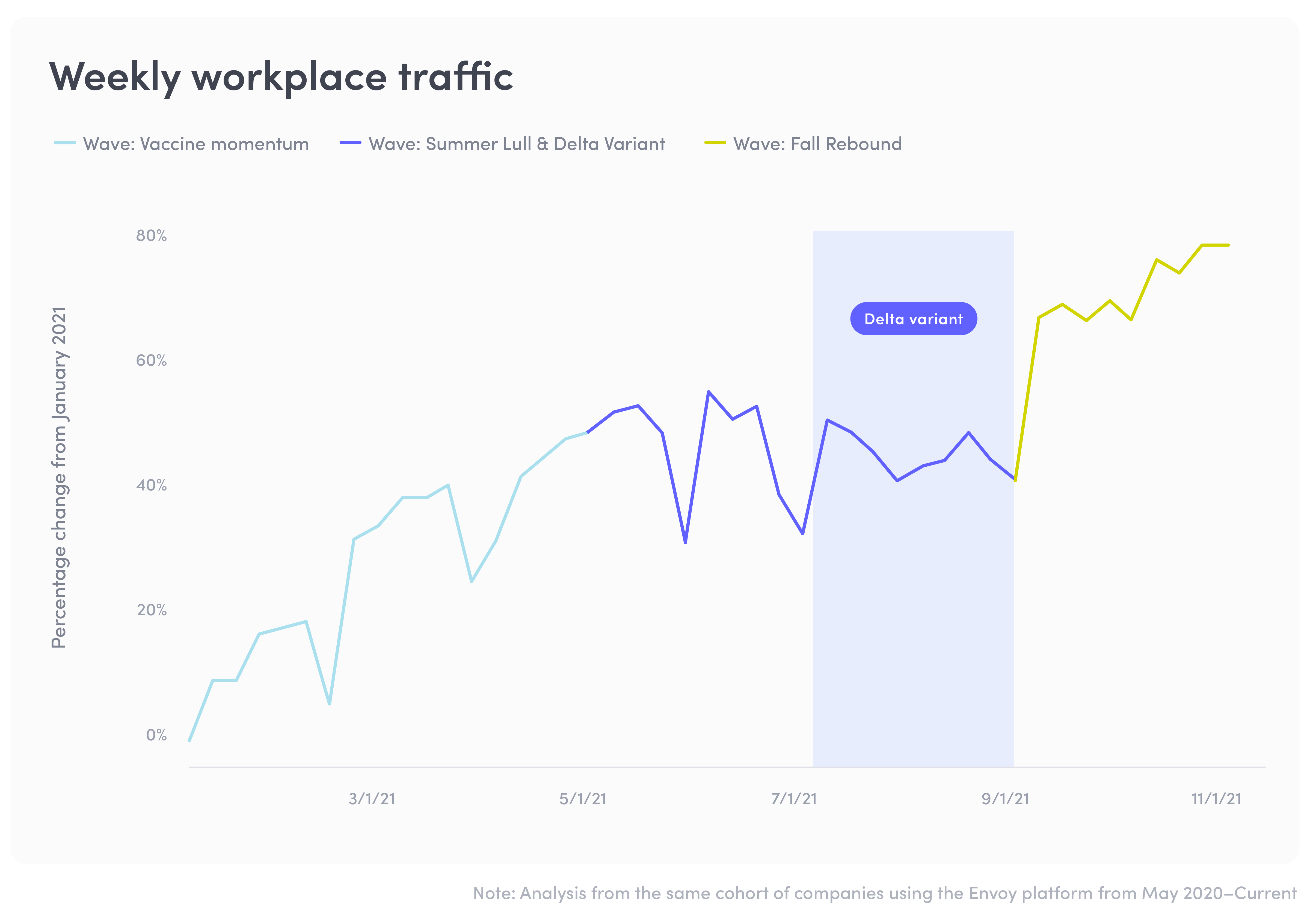 - In August, we wrote about the three waves of workplace traffic since the start of the pandemic: traffic from essential workers, traffic from vaccinated employees, and a slight lull in traffic due to summer and the Delta variant.
