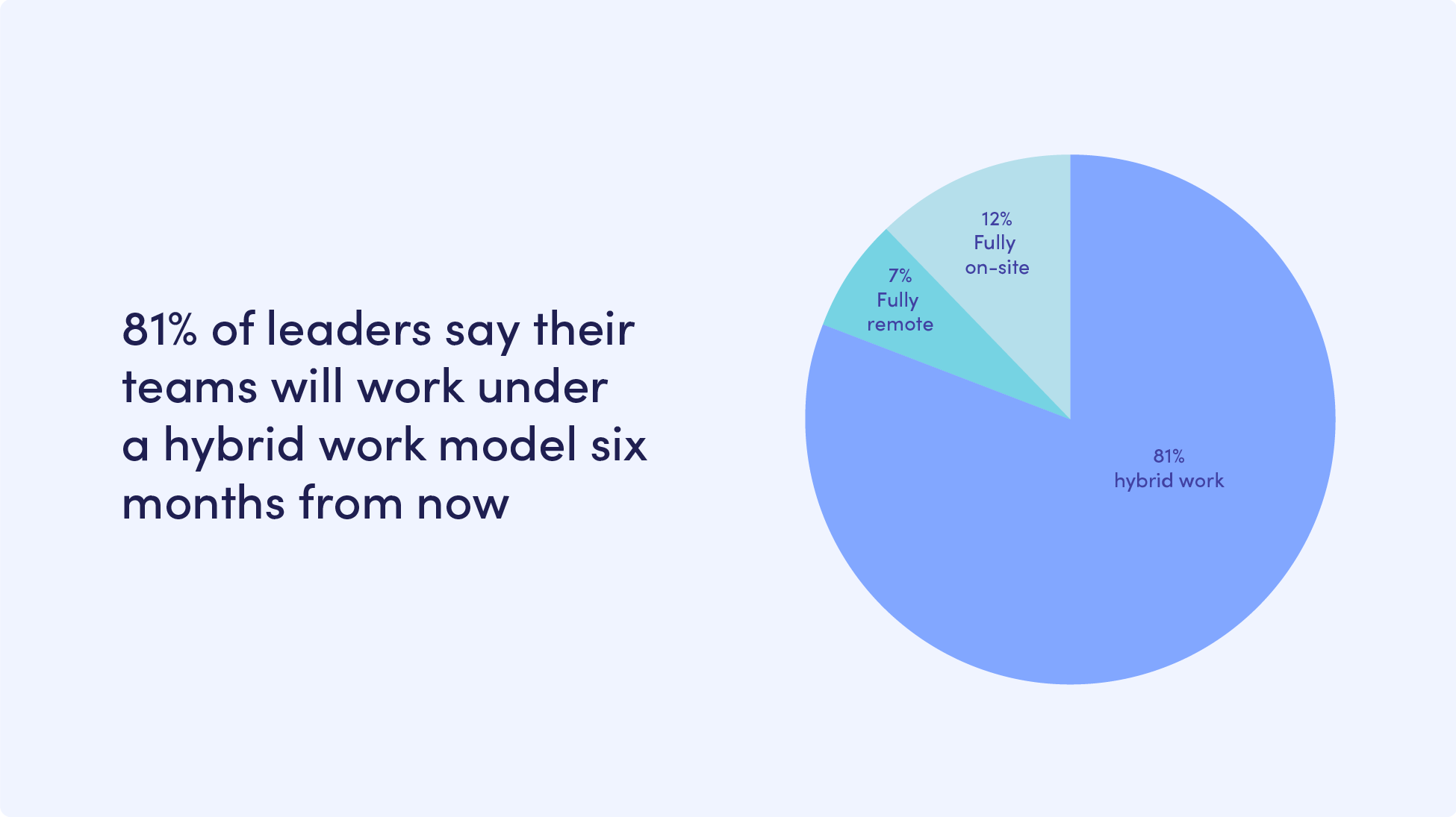 We surveyed workplace leaders at companies that have employees who can easily work remotely and employees who need to be on-site to do their work. 40% of these leaders said that their teams are currently working under a hybrid work modelâspending some of the workweek on-site and some remotely. When we asked the leaders where they expect their teams to work six months from now, 68% said they expect to have a hybrid work setup. This reflects the desire for flexible working options that many employees want post-pandemic. Â For companies where the majority of employees can do their work from home, 81% of leaders said their teams will work in a hybrid model six months from now. Almost 7% of those leaders said their teams will be fully remote, and 12% said their teams would be back in the workplace full-time. The driving force behind the move to hybrid work? According to 69% of leaders, their employees told them they prefer a hybrid work model. Â