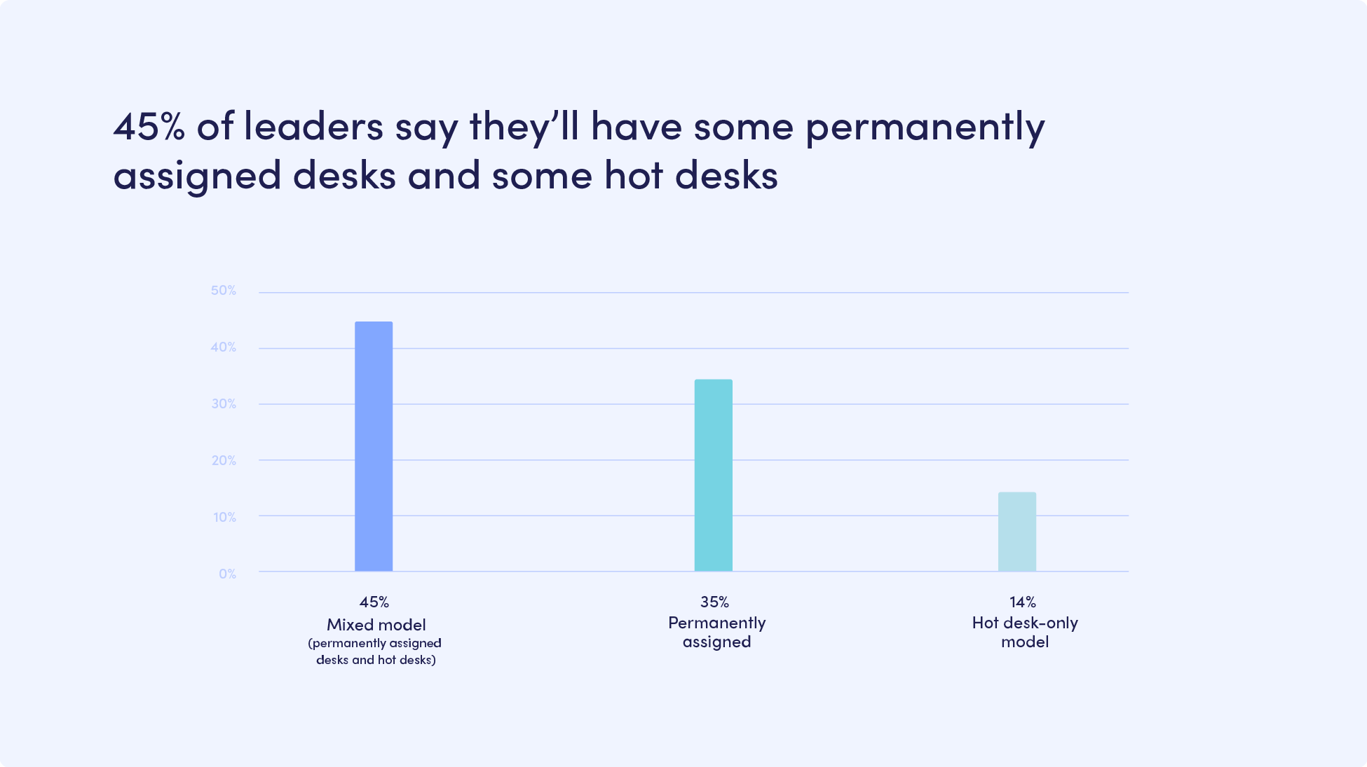 - 45% said theyâre transitioning to a mixed model with some permanently assigned desks and some hot desks.