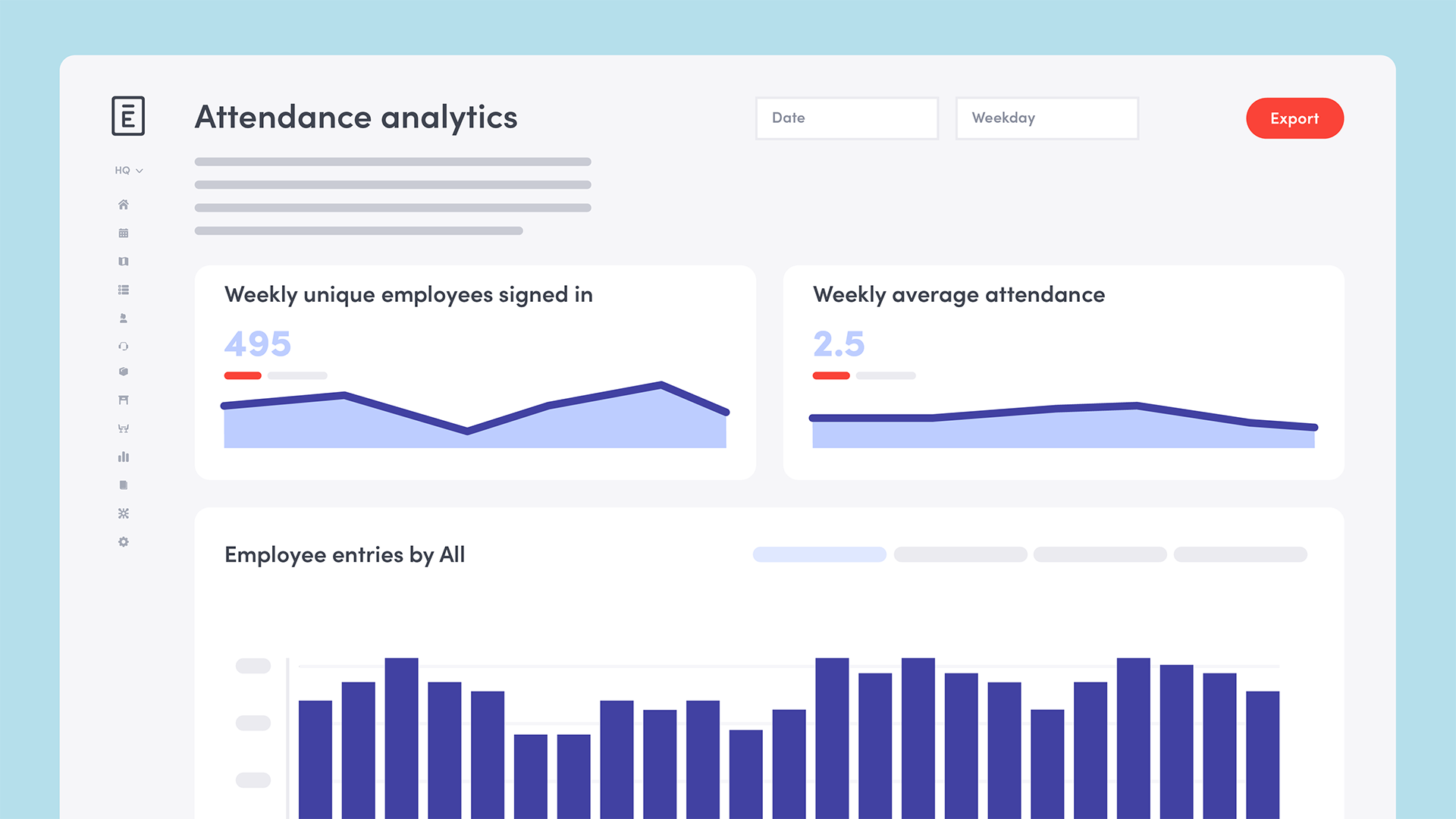 Employee attendance data is invaluable for space planning, showing you trends in your workplace utilization and peak occupancy times. Envoyâs attendance analytics dashboard lets you see which days of the work week have the highest onsite attendance, which departments are onsite the most often, and whether or not your employees are complying to your onsite attendance policy.