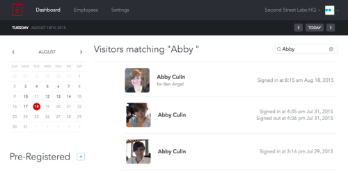 With Envoy’s new search feature, you can easily access any individual visitor’s sign-in data, right on your web dashboard. Just search for their full name (for best accuracy), to find all of their entries. And if you need to tuck this information away to access later, it’s super simple to export as a CSV.
