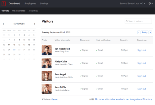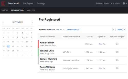 See at a glance who’s arrived and who’s still expected. Red means the visitor is 20+ minutes late, green means they have signed in (and are still signed in), grey means they have both signed in and out, and no color means they’ve yet to sign in.See at a glance who’s arrived and who’s still expected. Red means the visitor is 20+ minutes late, green means they have signed in (and are still signed in), grey means they have both signed in and out, and no color means they’ve yet to sign in.
