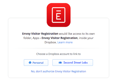 Envoy simplifies NDA signing, and now the Envoy + Dropbox integration makes NDA storage a breeze, too. With this integration, a PDF of each signed NDA is automatically uploaded into your Dropbox to ensure that files are secure, organized and easily accessible. Learn more about our Dropbox integration.