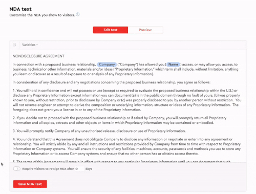If your location requires visitors to re-sign the NDA after a certain period of time, Envoy can help you keep your records up to date. Now, it’s easy to enable the ‘require visitors to re-sign’ feature, and enter the desired number of days. Once enabled, all visitors will automatically be prompted to re-sign the NDA when needed. Learn more about to setting NDA expiration dates.