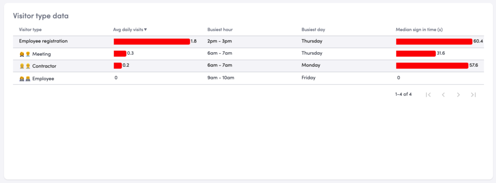 - Visitor type data - How many average daily sign-ins, busiest hour for this particular visitor type, busiest day for this particular visitor type, and the median time it takes visitors to sign-in on your kiosk.