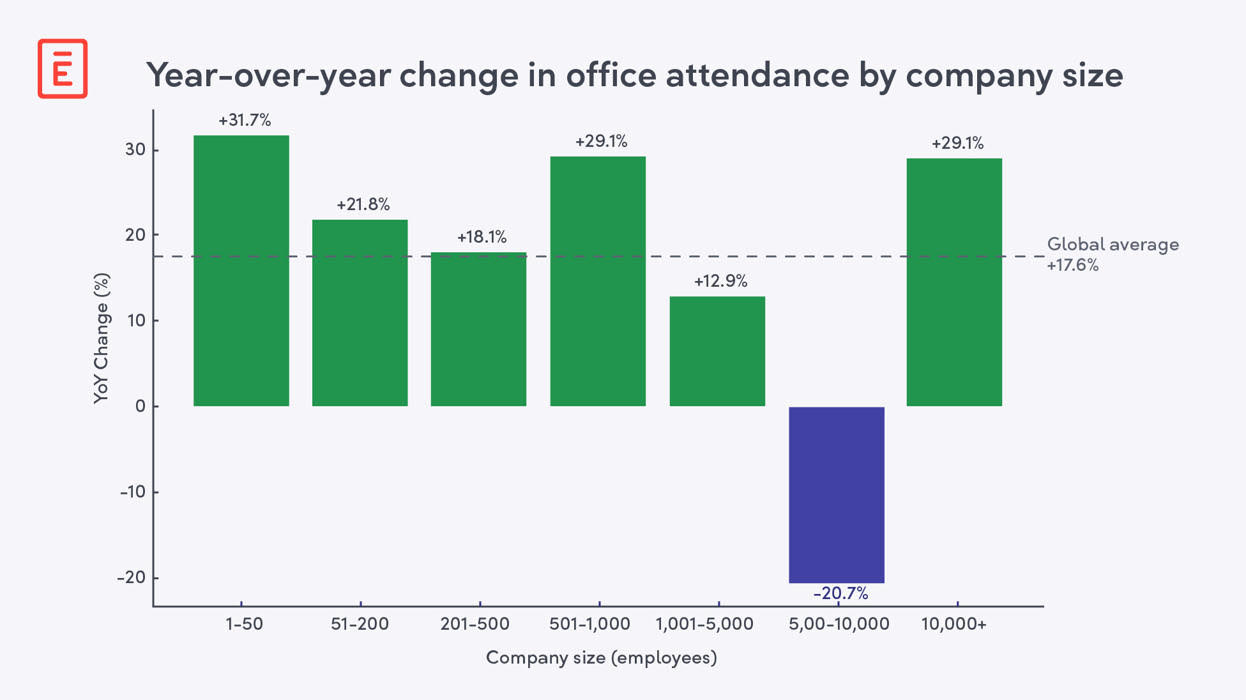 The office comeback isn’t just about where you work. It’s about who you work for. New Envoy data shows that overall workplace traffic grew 17.6% year over year. But averages only tell part of the story. The real differences emerge when you look at company size.