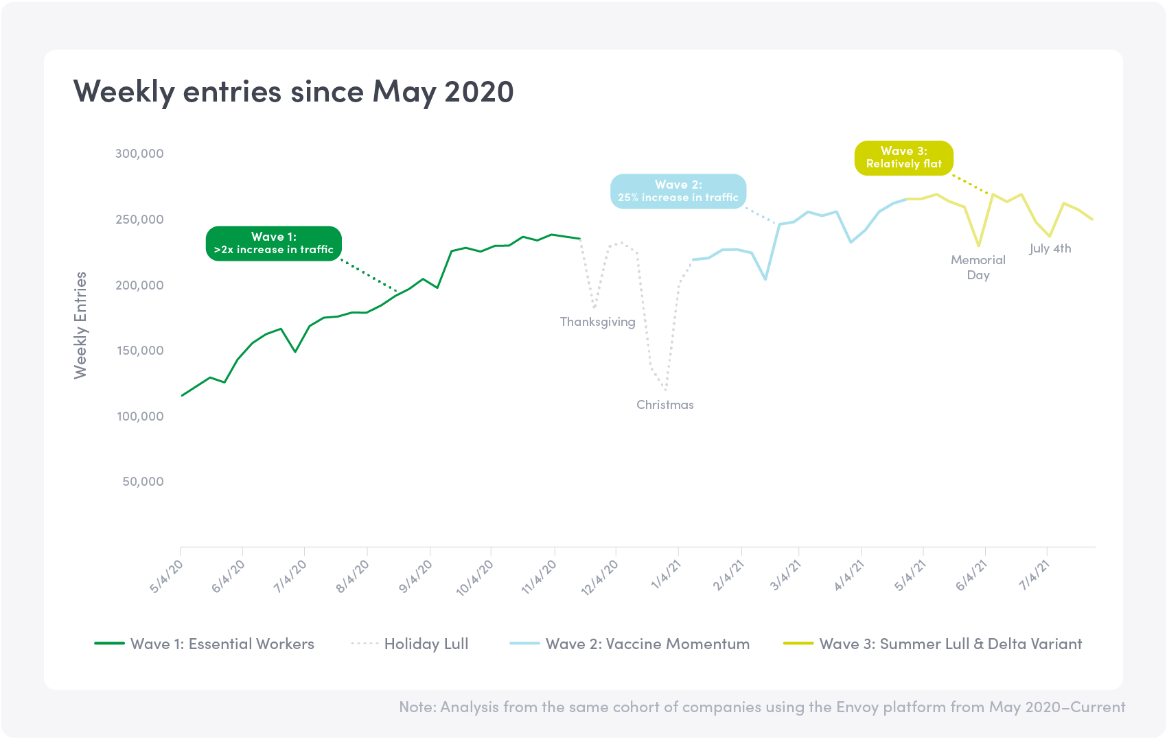 Finally, a summer lull coupled with increased concerns of a new highly-contagious Delta variant marks the third wave. During this phase, weâve seen a slight decrease in growth (-4%) since the start of summer. Some of this could be due to the typical summer lull of employees taking more vacations. But we believe much is in reaction to the Delta variant. Itâs worth noting that while the new variant is concerning, the data so far has painted a picture thatâs much different than what we saw at the start of the pandemic.