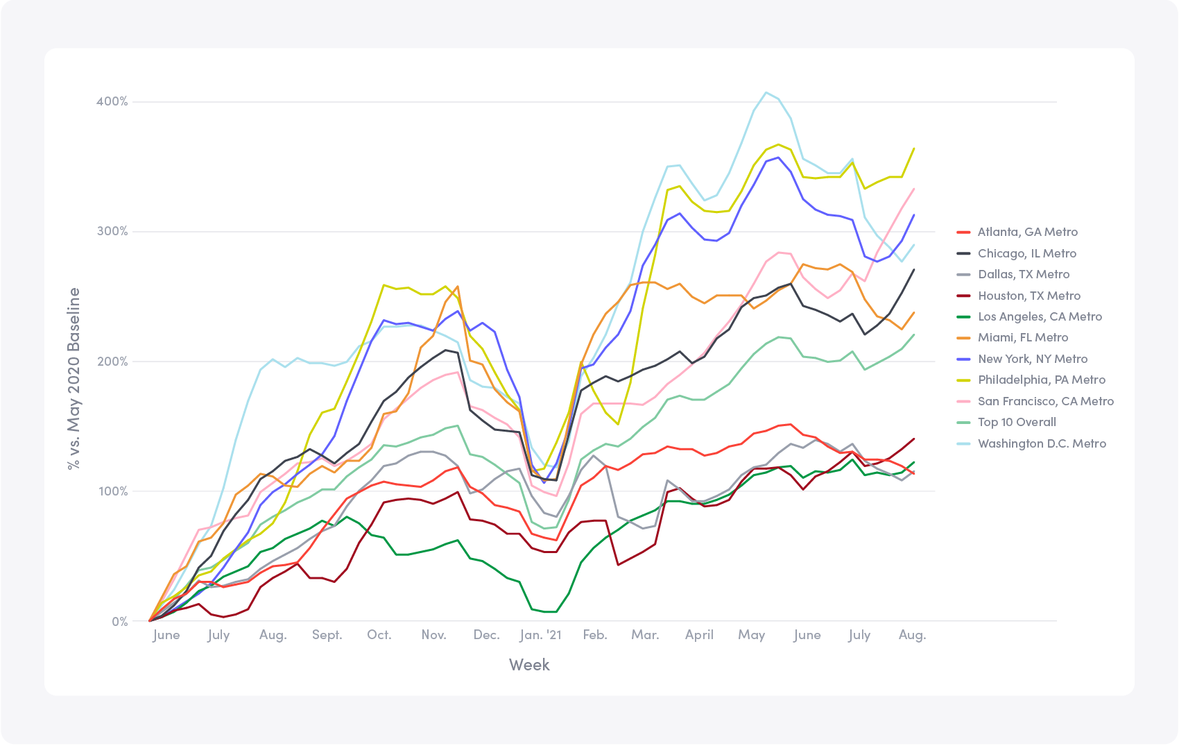 First, weâre not seeing 80% decreases in traffic like before. Weâre seeing a slight decrease (-4% in weekly entries since the start of summer) as we collectively take more precautions to stay safe from this new variant. And while most of the major media coverage paints a âdoom and gloomâ picture like we saw last spring, we actually see quite a few areas of return-to-work resiliency. For example, traffic in the top 10 US metropolitan cities is up 10% since last month. Weâre continuing to see strong growth in San Francisco, Philadelphia, New York City, and Chicago. The chart below shows how workplace foot traffic has changed in the top 10 US metropolitan areas compared to a May 2020 baseline. Percentages reflect a weekly average of workplace entries in each market compared to a May 2020 baseline.