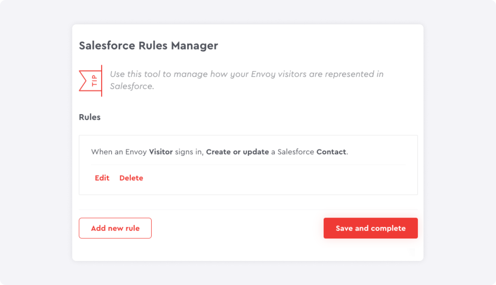 The integration is easy to set-up with no technical experience necessary. With our Salesforce Rules Manager, you have the flexibility to configure how Envoy fields map into Salesforce. Set it, then forget it.
