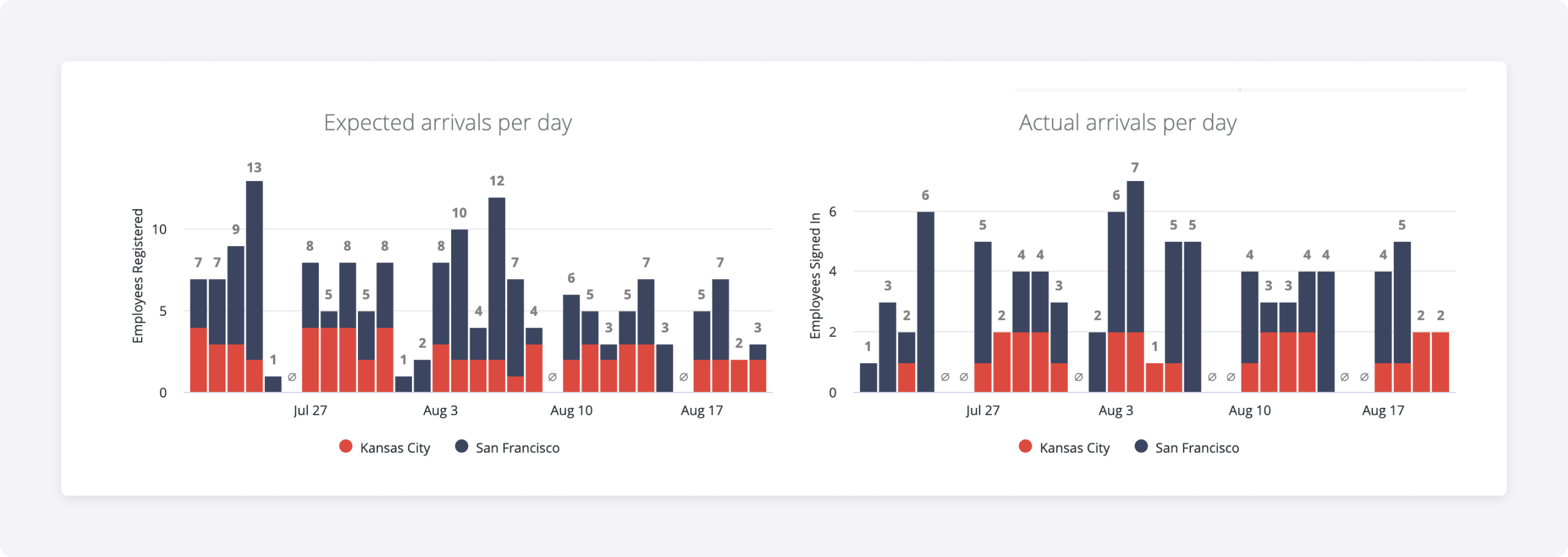 Envoyâs own Head of Workplace and Technology, Matt Harris, shared how he uses these reports to stay informed. âChecking Protect analytics helps me understand what the trend is so I know what to expect moving forward. This data helps me predict what actual occupancy will be each day. And this gives me insights to plan ahead for high occupancy days.â For example, in the graphs below, you can compare how many employees registered for the day to how many actually signed in at each of your office locations.