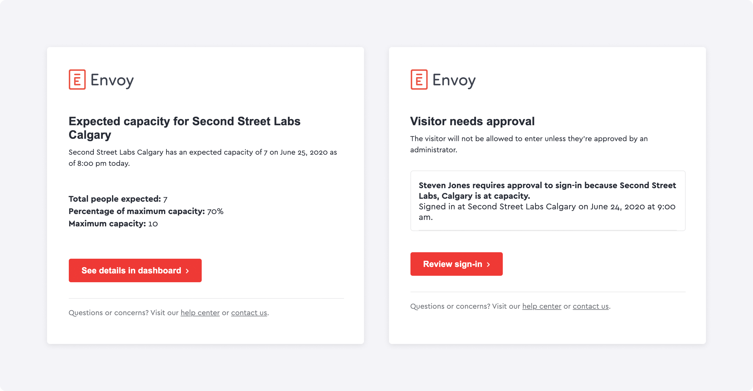 With Envoy Protect, you can set and enforce a capacity limit for how many people can be in your workplace at any time. Once you reach capacity, Envoy will automatically stop employees and visitors from being able to sign-in and alert your team so they can approve or deny entry. This helps keep your people safe by preventing overcrowding. Youâll also minimize risk to your business by ensuring all of your spaces meet social distancing regulations.You can track capacity and occupancy data in a few different ways in Envoy Protect: