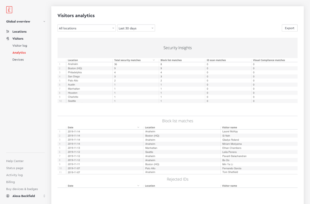 You can also get insight into how your locations compare when it comes to security and compliance. View how many visitors sign out as well as how many security alertsâdue to a block list match or rejected IDâare triggered at each location, so you can take action to fill in any gaps in security.