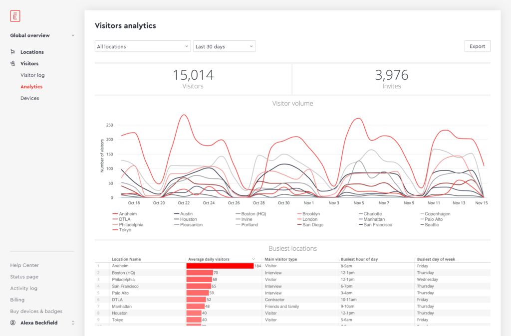 Now you can get a holistic view of how your company manages visitors with the new analytics dashboard in your global overview. See at a glance how many people visit each location and for what reason throughout the year, so you can make data-driven decisions about how many security guards to staff or how much lunch to order.