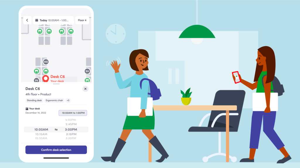 To make the most of your space, employees now have the option to specify which hours they want to reserve a desk. So if they book a desk from 9:00am-1:00pm, that desk is free for another employee coming in for the afternoon. To book a desk by the hour on the mobile app, employees just need to toggle off the “All day” button and select their desired reservation time frame. Learn how.