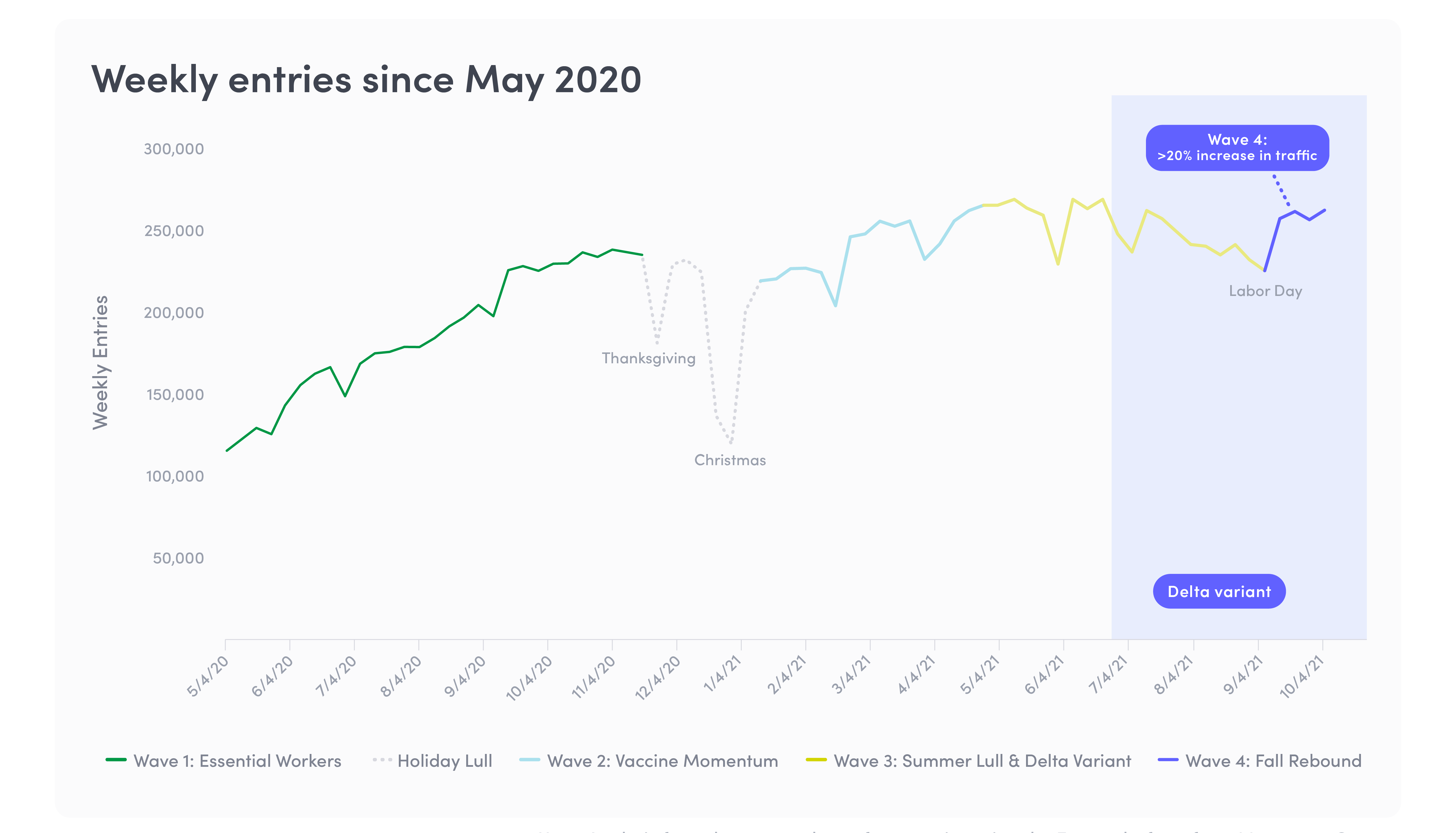 The data in this blog post looks at workplace entries from 5/1/2020-10/1/2021.Workplace traffic has had its ups and downs over the past year. Back in August, we wrote about the three waves of workplace traffic since the start of the pandemic: traffic from essential workers, traffic from vaccinated employees, and a slight lull in traffic due to summer and the Delta variant. So what’s happened since then? In our recent analysis of workplace foot traffic, we’ve seen a surge in people working on-site and the start of a new wave. In other words, the return-to-office is on. Here’s what we found: