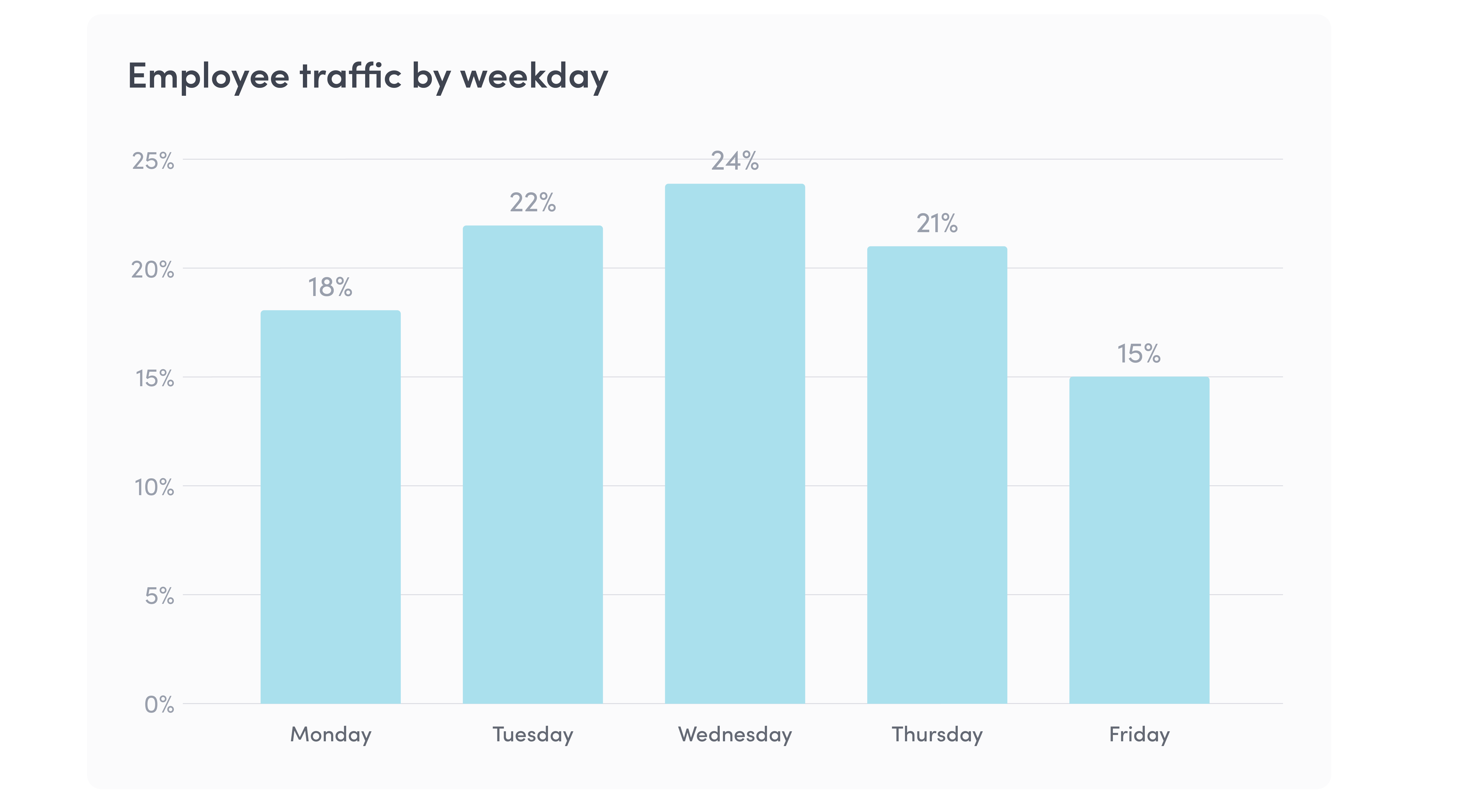 On average, nearly 70% of all employee traffic happens in the middle of the week (Tuesday-Thursday). Wednesdays remain the most popular day to come into the workplace. Friday is still the least popular day.