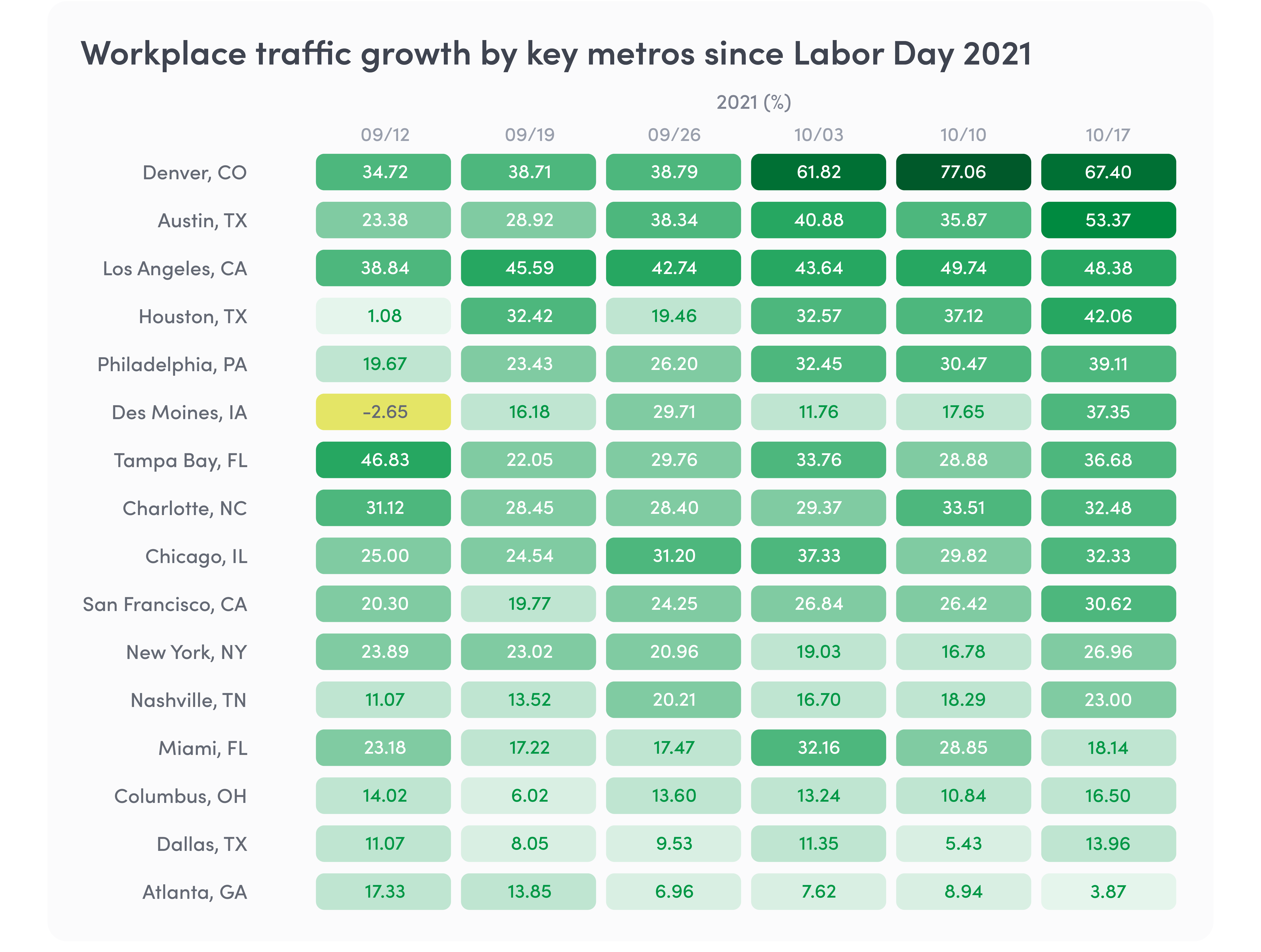 - US metropolitan cities have seen strong growth: Denver and Austin have both seen more than 50% growth in workplace traffic since Labor Day