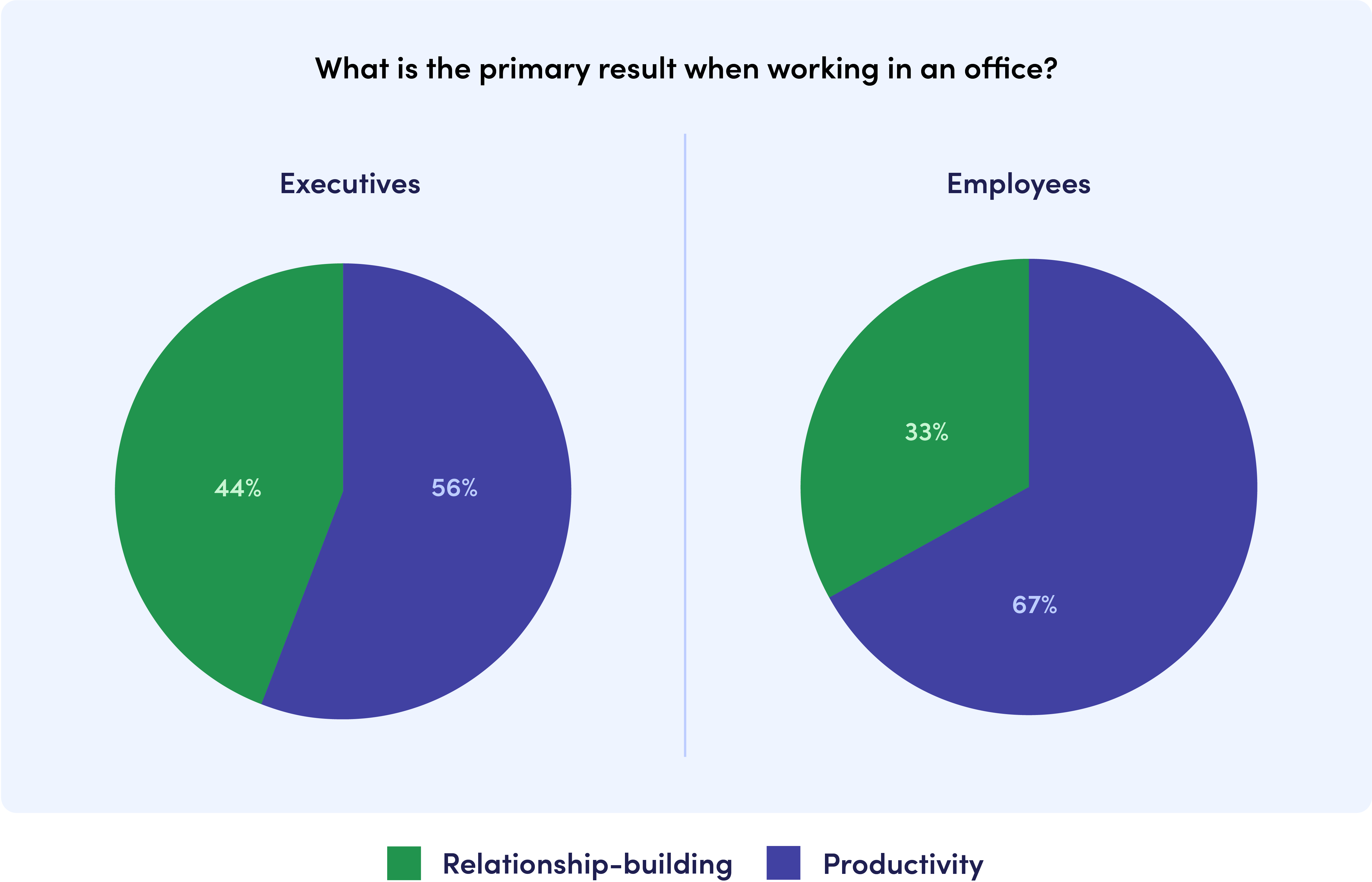 Executives and employees arenât totally aligned on the purpose of the workplace. While employees maintain productivity to be the most important outcome of working in an office, executivesâ responses tell a much more complex story. Regardless of whether productivity or relationship-building reigns supreme, the workplace is the home for both. A workplace can be where employees come to get their weekly work done. But it can also be where they come in to collaborate and socialize with their colleagues. As a workplace manager, itâs important to create spaces for both of these preferences to thrive.