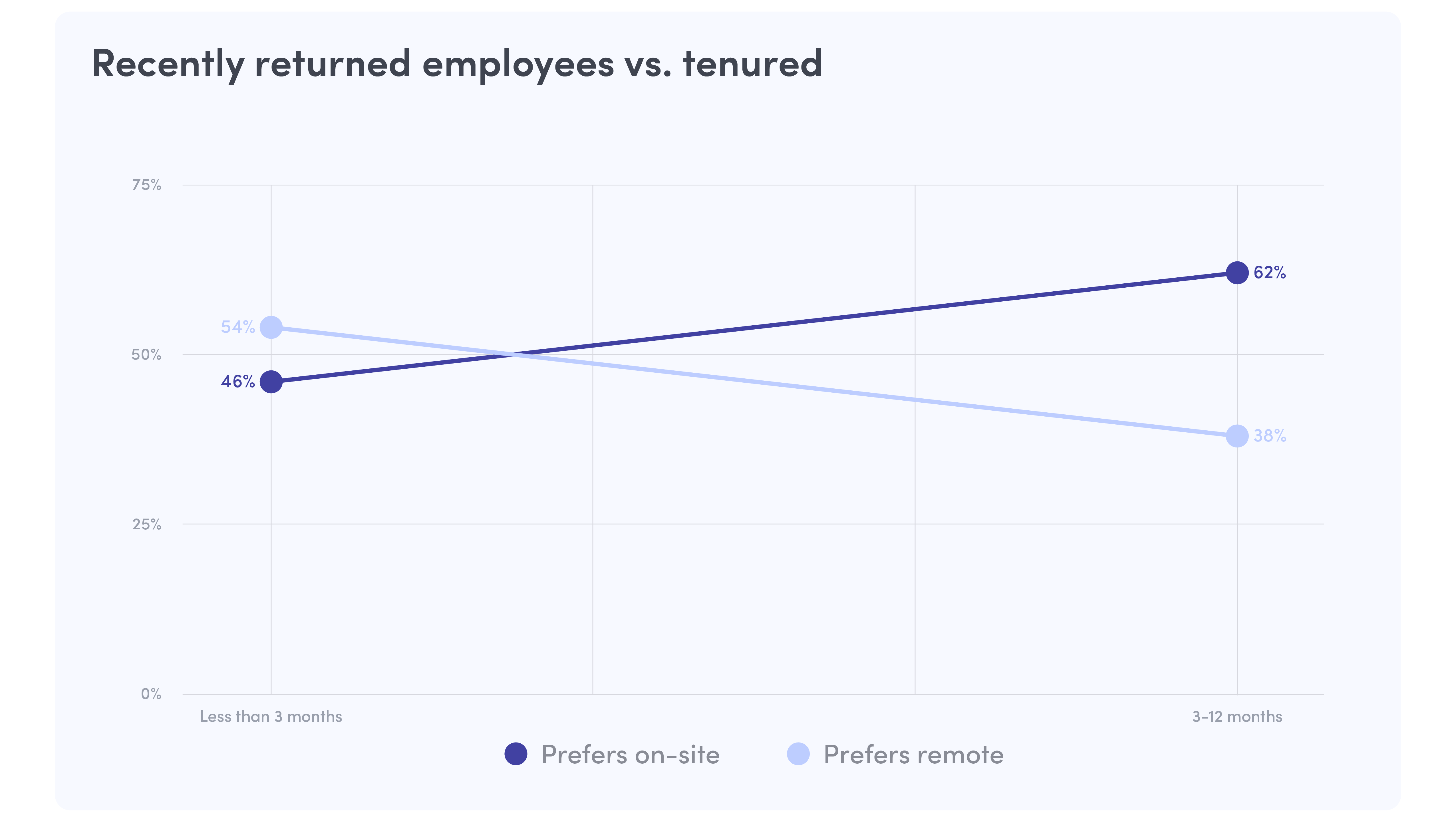 62% of employees whoâve been in the workplace for more than three months said theyâd prefer to work on-site most of the time. In contrast, 54% of employees who have been back to the workplace between a week and three months said theyâd prefer to work remotely most of the time.Many employees have spent the past year or more working remotely and have settled into their own routines. Getting back into the swing of working on-site is a process. Once they get over the initial hurdle of having a new routine, most employees (62%) actually prefer to work mostly on-site.