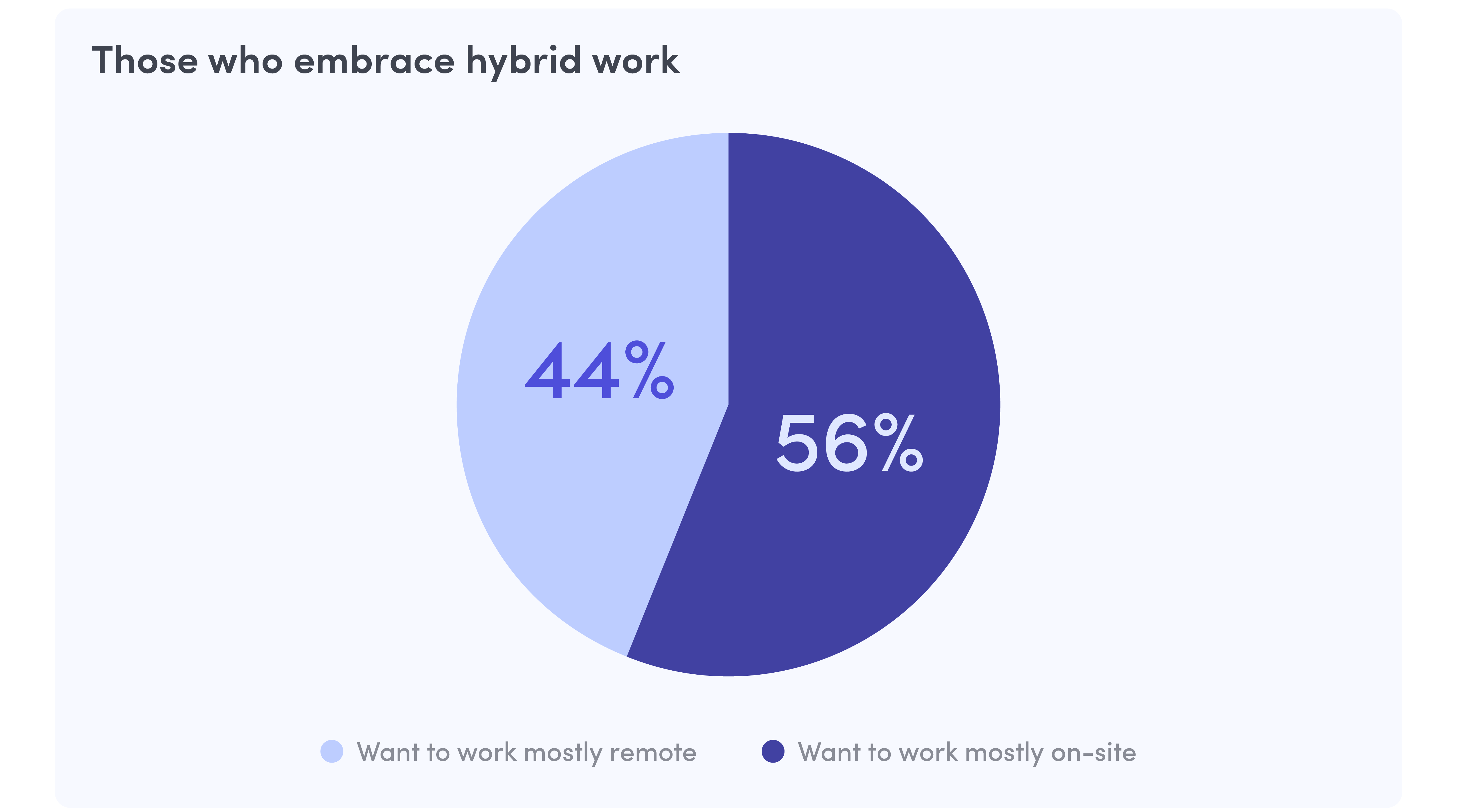 Most employees (56%) who embrace hybrid work said they want to work on-site most of the week. 44% of employees who prefer hybrid said theyâd want to work mostly remotely. As for employees who donât prefer a hybrid work model (29%), 12% said they want to work remotely full-time. 16% of these folks would prefer to be on-site full-time.