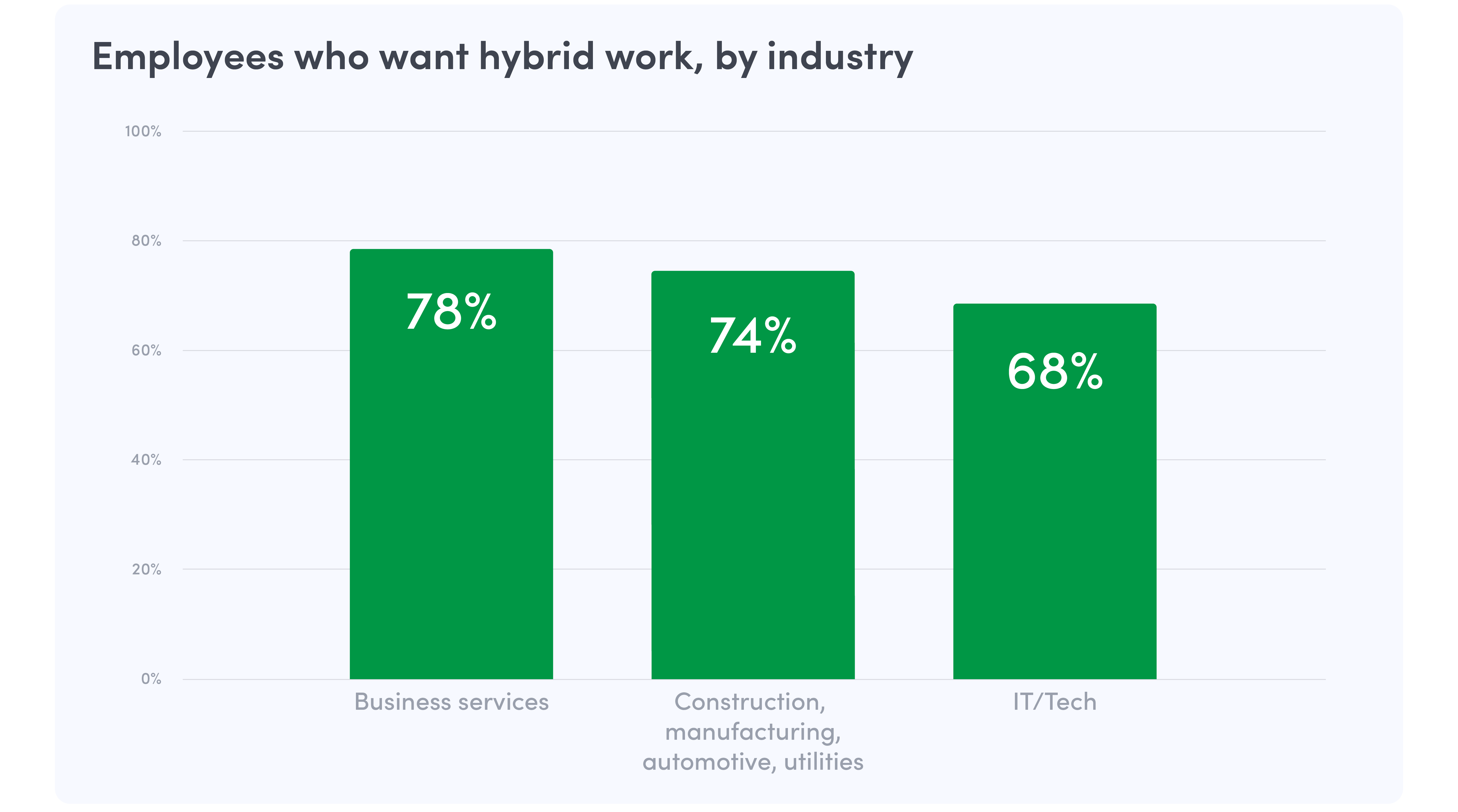 Interestingly, employees in industries outside of tech want hybrid work the most. About three-quarters of employees in the business services industry (78%) said they prefer a hybrid work model. Slightly fewer employees in construction, manufacturing, automotive, and utilities (74%) said the same.