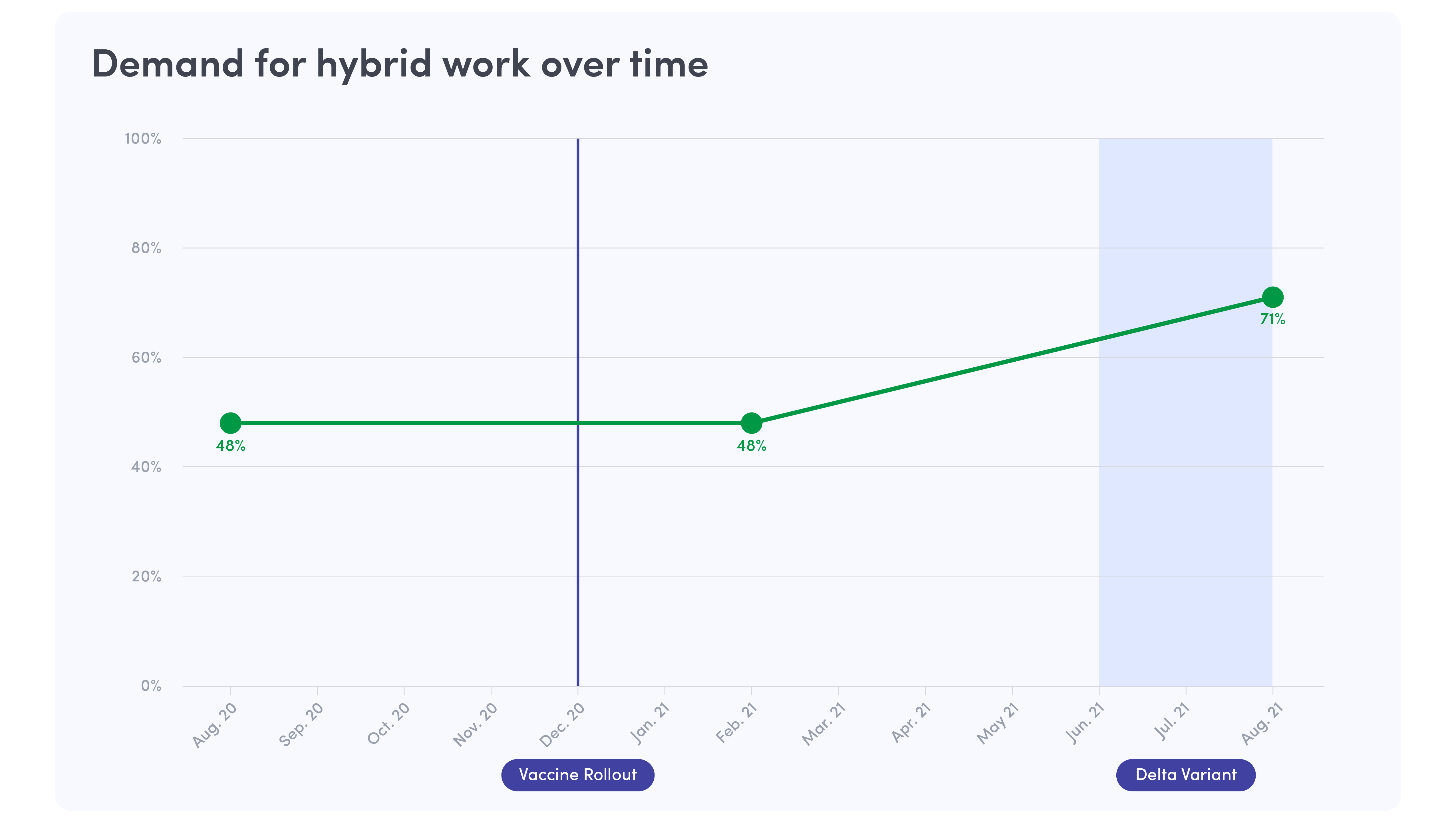 In surveys we conducted in September 2020 and February 2021, 48% of employees said they wanted hybrid work. But after a year of working remotely during the pandemic, employees are finding the workplace and in-person experiences more appealing. Word of mouth could also be responsible for driving up demand for hybrid work. As more people hear of companies adopting this working model, it could be leaving them wondering, âHey, what about us?â
