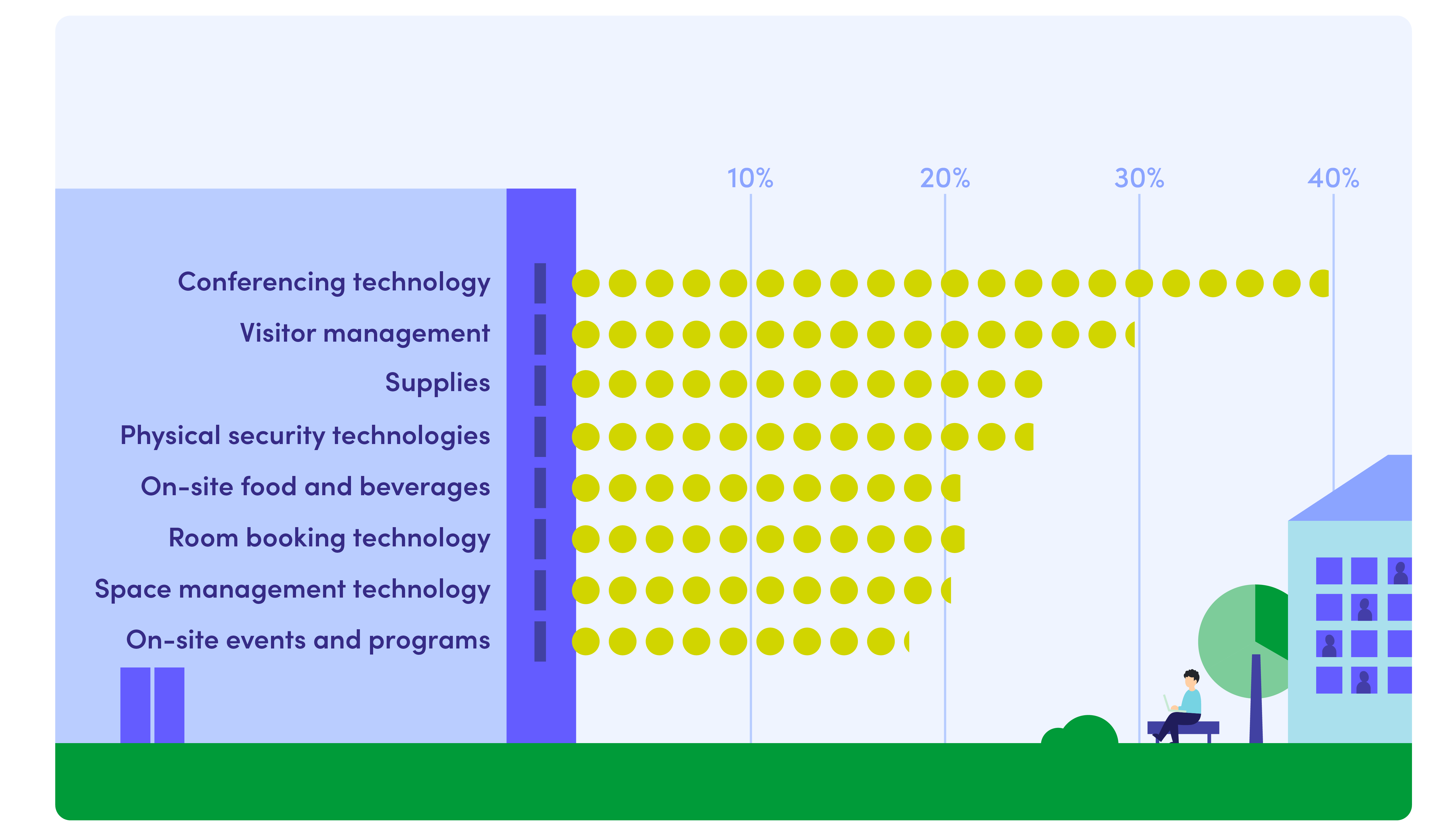 Finally, we wanted to know where workplace leaders believed their companies should invest in the workplace moving forward. 35% said on-site events and programs. 24% said in-office food and beverages. The numbers were even higher for folks in workplace manager roles: 43% and 26% for those investments, respectively. Thatâs probably because these are the folks most likely to be responsible for the workplace experience and employee happiness on-site.Also notable, 23% of workplace leaders see a need for spending more on conferencing technology. 28% cite remote collaboration tools as an important investment. Workplace teams understand that flexible work is here to stay. To create a great workplace experience for employees, organizations need to invest in technologies that make hybrid collaboration seamless.
