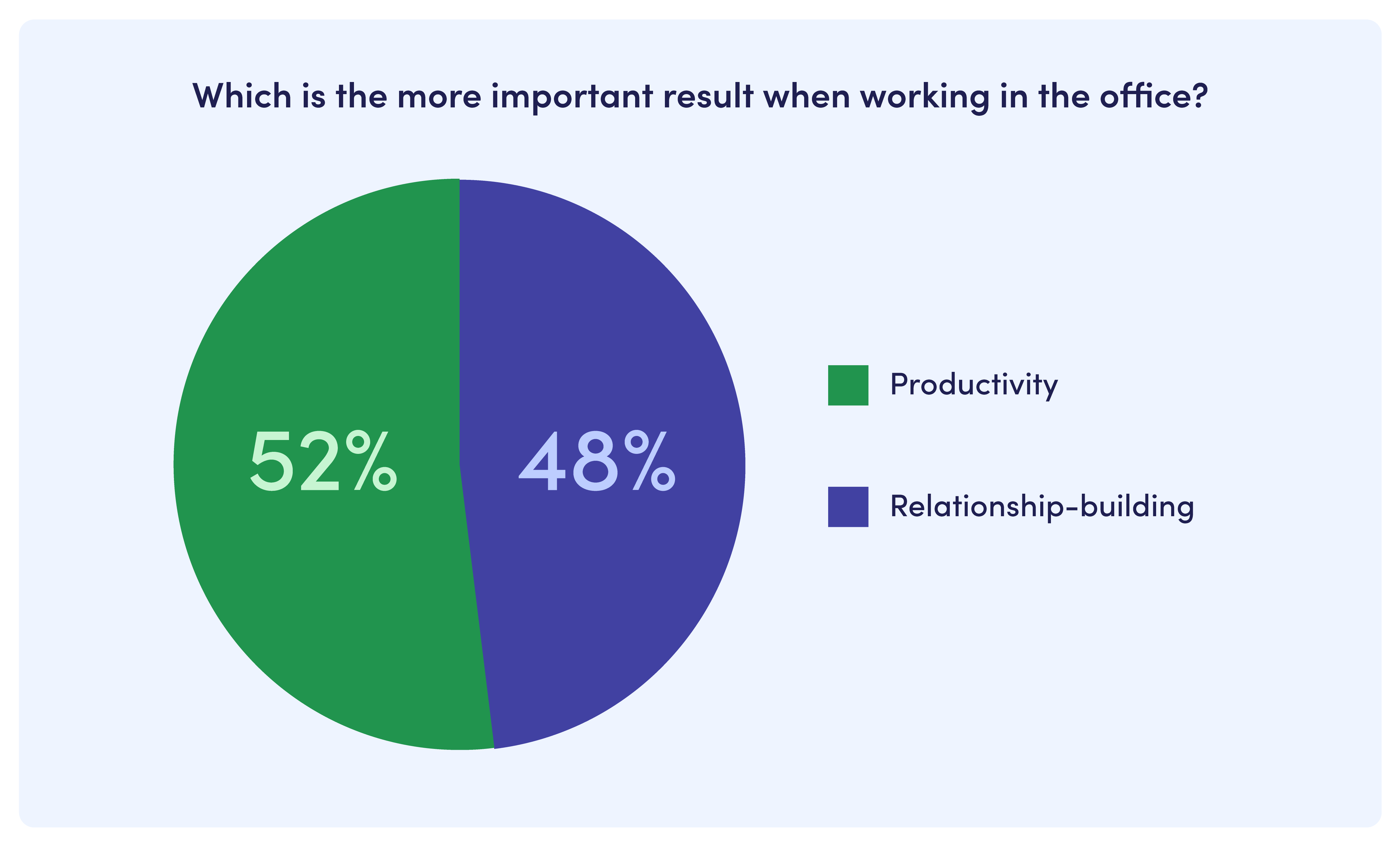Many leaders have claimed that say they are eager to bring employees back into the office to foster relationships among coworkers and build workplace culture. But we were curious, what do leaders truly care about when their teams are working onsite? So we asked executives in the UK what the most important result of working in an office is: productivity or building relationships with coworkers. One would think relationship building would win out, given how many CEOs are citing the primary benefit of the workplace being collaboration and community. However, our survey found that most executives (52%) say productivity is the more important outcome of working in an office.