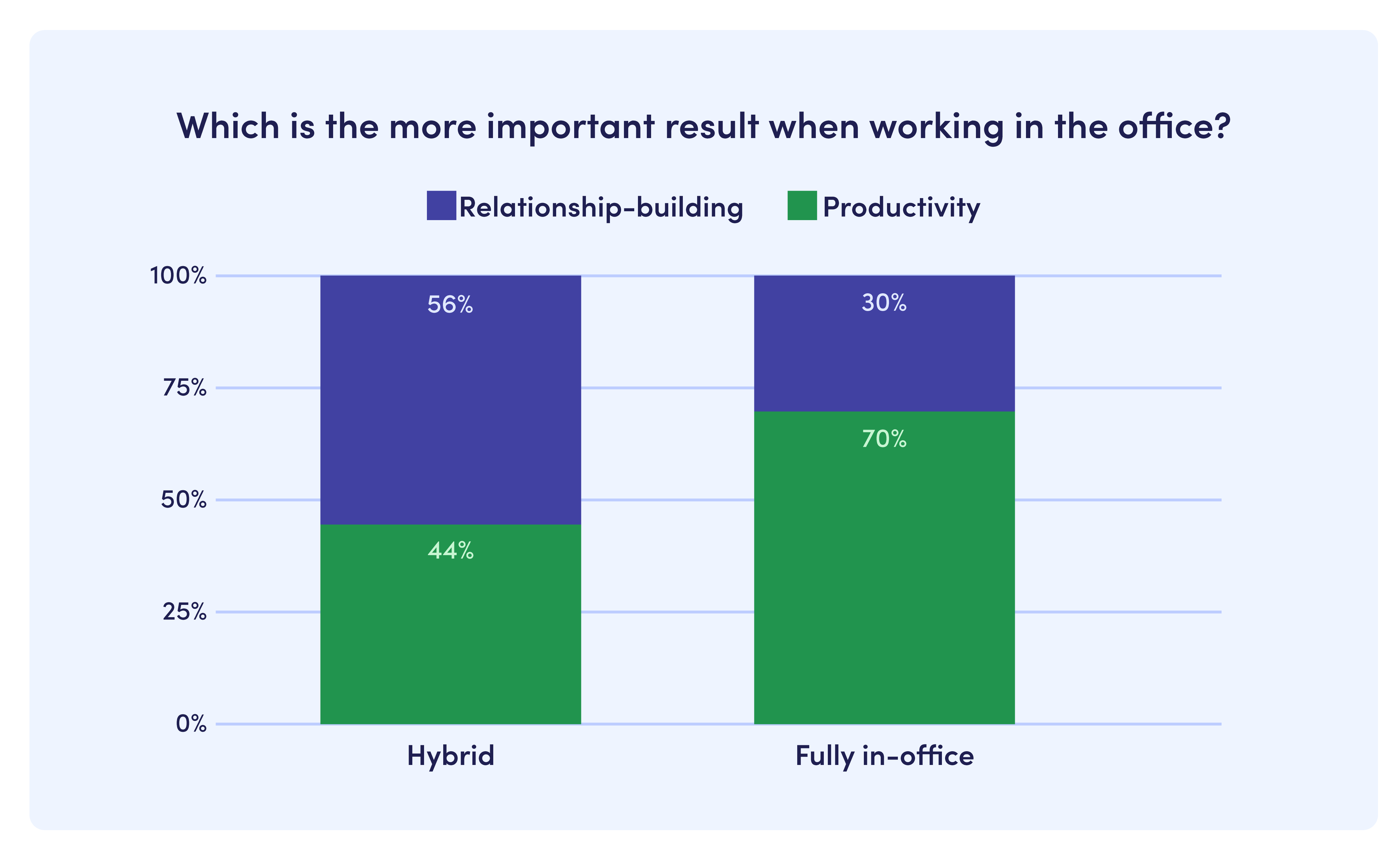 Finally, we wanted to know if a company’s office attendance policy played a role in what employees value. Does hybrid work actually create more intention for employees to go to the workplace to get together and collaborate with colleagues? The answer is yes. Compared to those in the office full-time, hybrid employees are 86% more likely to value relationship-building more than productivity on-site. The majority (56%) of hybrid employees say that they go into the office more to collaborate with colleagues in person. It’s just far easier to meet, brainstorm, collaborate, and solve problems face-to-face. On the other hand, 70% of employees who are in the office five days a week value their heads-down productive time more than building relationships with coworkers.