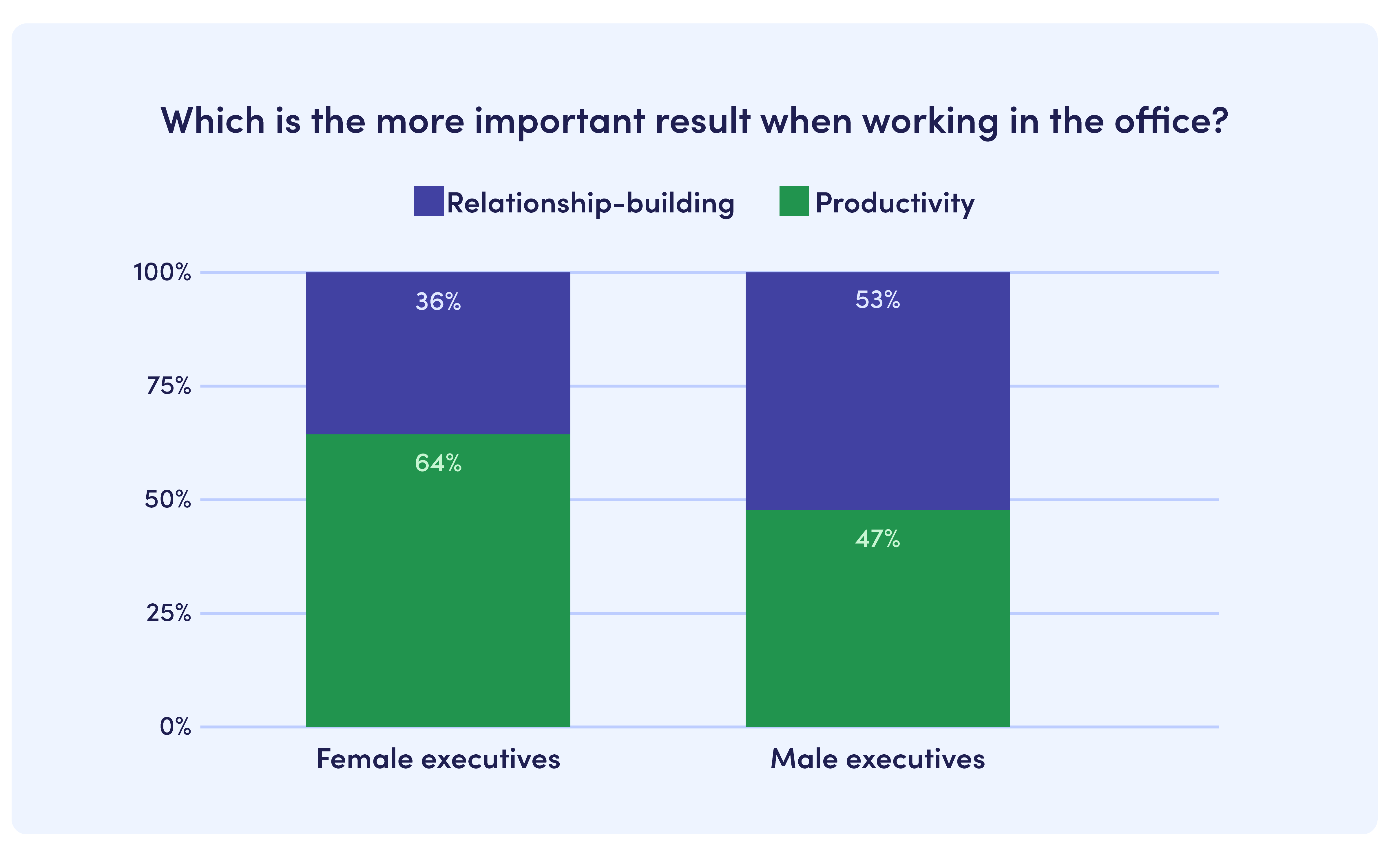 Interestingly, executives in the UK who identify as female were 36% more likely to value productivity over relationship-building compared to their male colleagues. The majority (53%) of executives who identify as male were actually more likely to value relationship-building over productivity onsite.