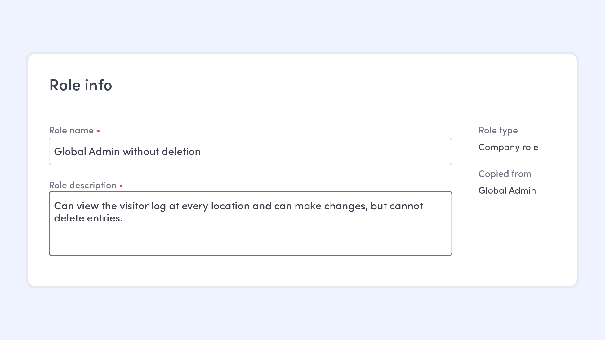 - Fully tailored admin roles. Start from scratch or adjust base roles to give teammates the exact level of access they need. This is perfect for front desk admins or executive assistants who handle visitor flow or desk reservations but don’t need access to sensitive dashboard settings.