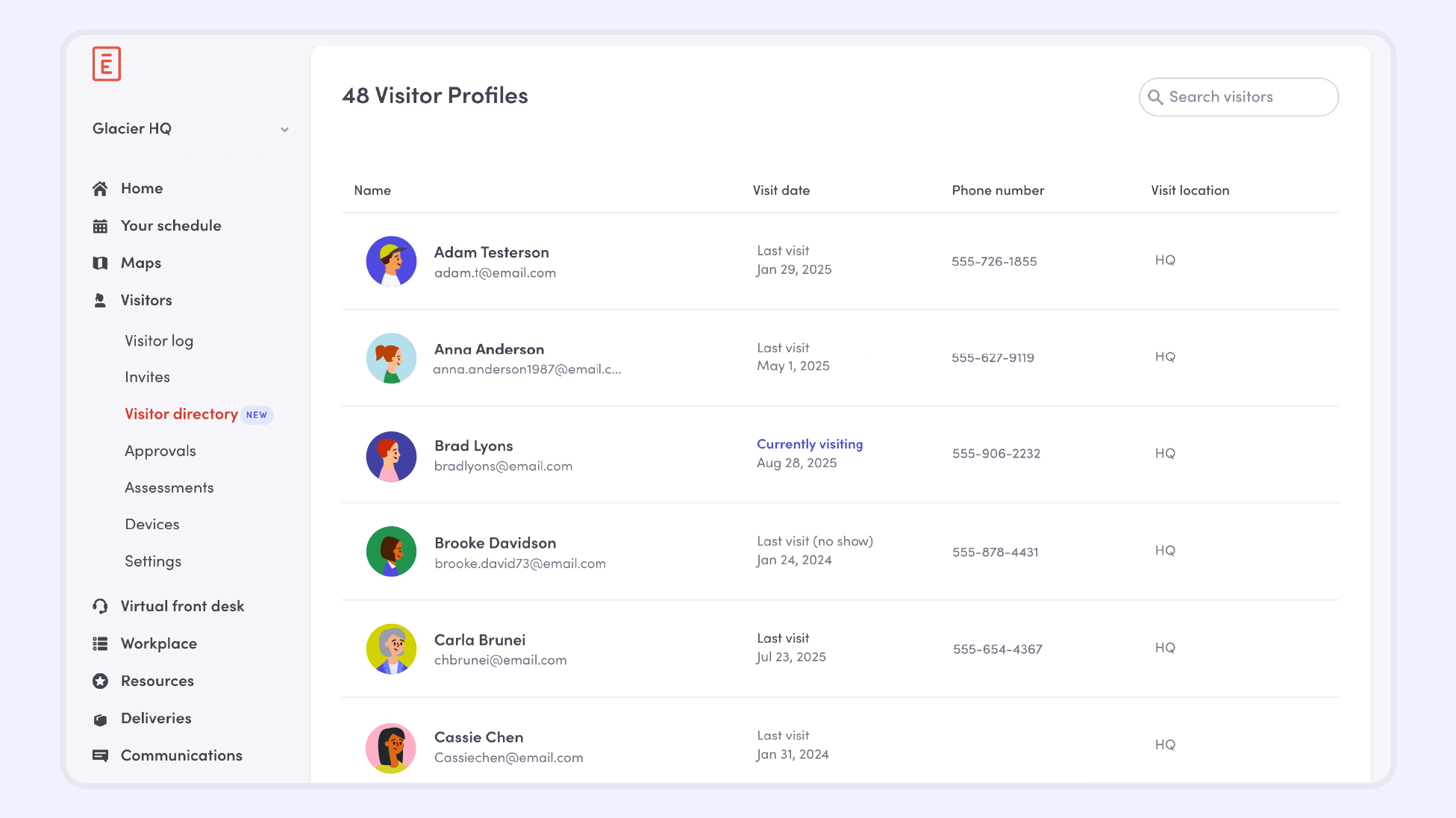 - Visitor profiles. See each visitor’s full history, upcoming visits, and previous no-shows. Profiles make tracking repeat visitors and managing visits simpler.
