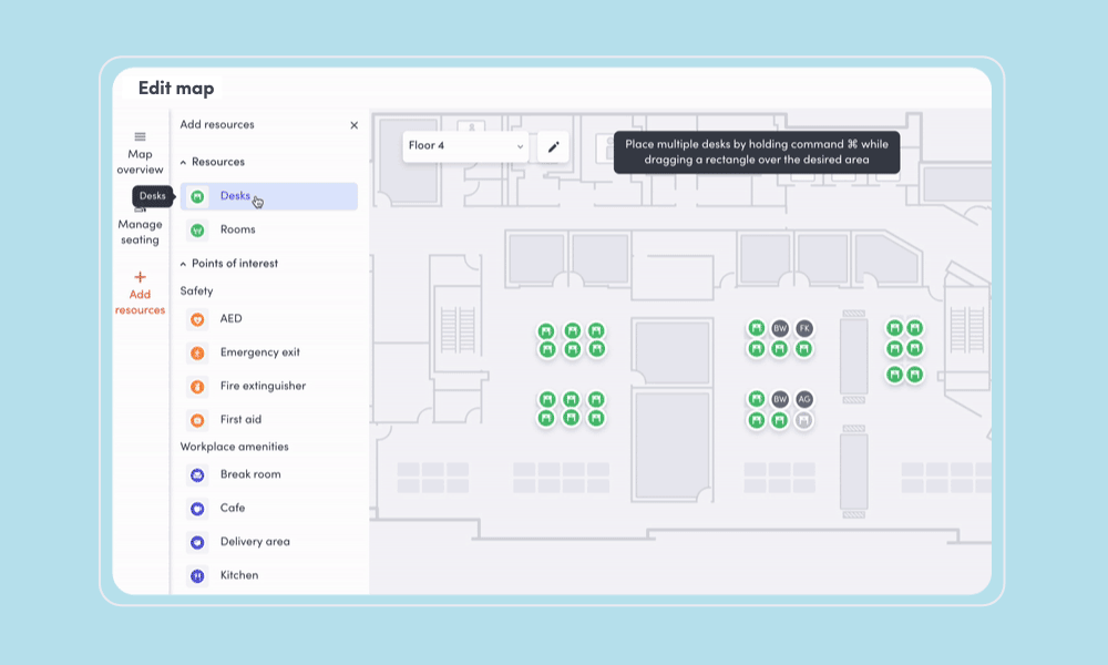 Admins can now add multiple desks with a simple drag and drop. Envoy Workplace leverages computer vision AI to detect and place multiple seats in just a few clicks. Admins can confirm bulk placement and decide how desks are numbered before adding them to the workplace map. Learn more.